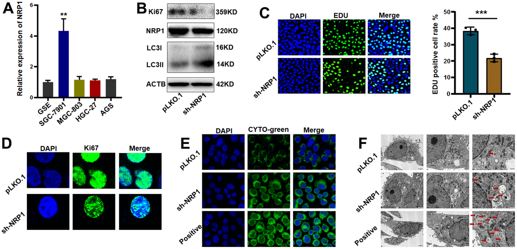 Differential expression detection of NRP1 by QPCR was performed (Figure 11A). Next, we constructed NRP1 stable knockdown cell line and applied western blot to detect the expression levels of NRP1, the cell proliferation protein marker Ki67 and the cell autophagy-related marker LC3I/II. As shown in Figure 11B and Supplementary Figure 2A, the expression of Ki67 decreased but the ratio of LC3II to LC3I was increased when NRP1 was knocked down, suggesting that knockdown of NRP1 may cause a decrease in cell proliferation and an upregulation of autophagy. Following this lead, we performed EdU experiment and cellular autophagy labeling assay. As shown in Figure 11C, 11D, the proliferative capacity of cells decreased by about 20% when NRP1 was knocked down, and the intensity of cellular autophagy increased (Figure 11E). To provide more reliable evidence that knockdown of NRP1 causes cellular autophagy, we fixed the treated cells and applied transmission electron microscopy to photograph the number and morphological changes of autophagic vesicles. It can be clearly observed in Figure 11F that the number of intracellular autophagic vesicles increased when NRP1 was knocked down.