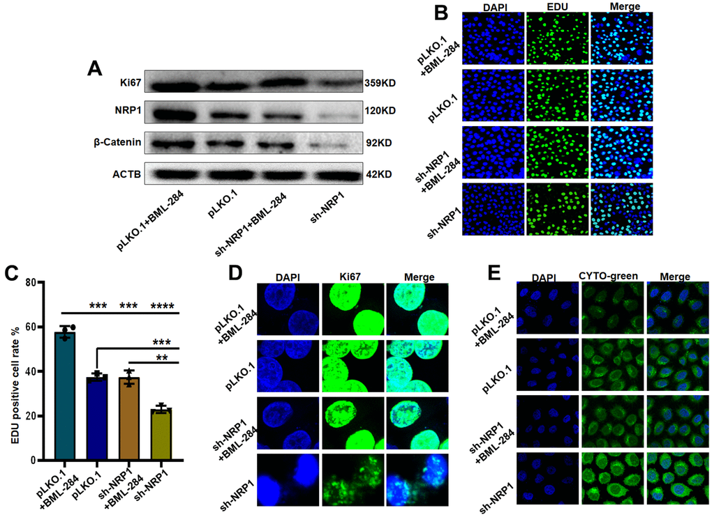 Next, we explore the signaling pathway through which NRP1 exerts its biological function. Western blot results showed that the level of β-Catenin decreased when NRP1 knockdown was achieved. However, when activator BML-284 was added to the knockdown cells, the expression of β-Catenin was elevated and the expression of Ki67 was increased with the addition of BML-284 (Figure 12A and Supplementary Figure 2B). Subsequent EdU and Cellular immunofluorescence assays provided further effective evidences (Figure 12B, 12C). EdU results showed that when BML-284 was added, the proliferation capacity of NRP1 knockdown group increased by 19.5%, while that of control group increased by 21.43%. The results of the cellular immunofluorescence assay were similar to those of the EdU assay ((Figure 12D). Finally the autophagy assay showed that autophagy was inhibited when BML-284 was added to the cells (Figure 12E). Taken together, the above experimental results suggest that NRP1 may exercise its ability to regulate autophagy and cell proliferation through the Wnt/β-Catenin signalling pathway.