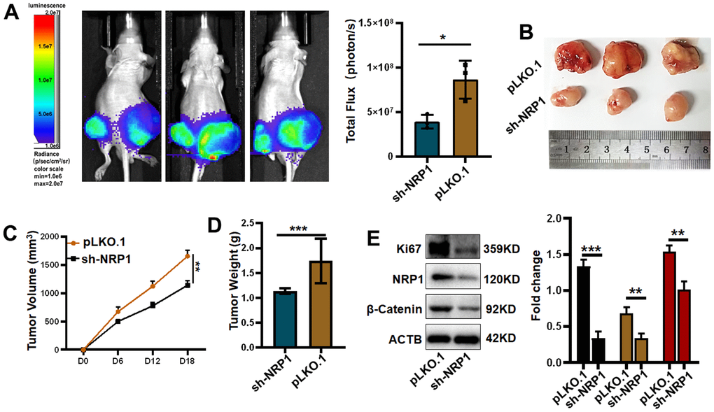 Finally, in order to investigate whether NRP1 affects tumour growth in vivo, a nude mouse xenograft tumour model was constructed for this purpose. The xenograft tumour models were examined in the Spectral Instruments Imaging System on day 18 after cells inoculation. The results showed a 54.68% decrease in bioluminescence signal in the sh-NRP1 knockdown group. The average decrease in xenograft tumour volume was 512.7 mm3, which represents a 30.97% tumour suppression rate due to knockdown of NRP1, and an average decrease in xenograft tumour weight of 47.34% to approximately 0.98 g (Figure 13B–13D). Finally, we extracted the proteins from the xenograft tumors and performed western-blot analysis. As shown in the Figure 13E, the expressions of Ki67, NRP1 and β-Catenin were significantly decreased in the NRP1 knockdown group compared with the control group.
