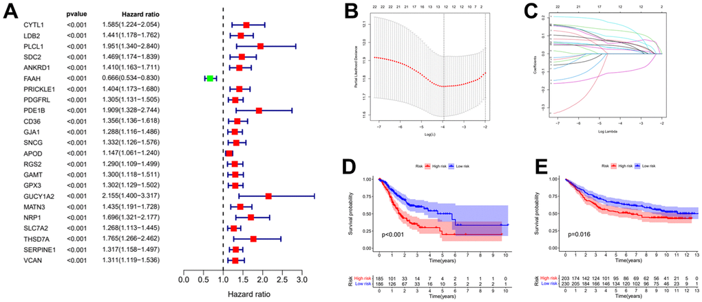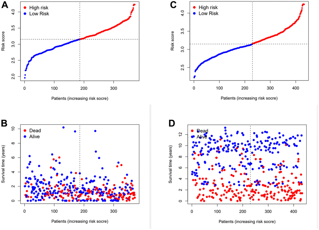 Subsequently, the risk coefficients of these 12 genes were used to calculate the risk scores of gastric cancer samples, and the samples were grouped according to the risk scores. The risk score is calculated with the formular: (expression of CYTL1 x 0.061+expression of ANKRD1 x 0.158+expression of FAAH x -0.101+expression of GJA1 x 0.028+expression of SNCG x 0.029+expression of APOD x 0.023 +expression of RGS2 x 0.04+expression of GAMT x 0.068+expression of MATN3 x 0.089+expression of NRP1 x 0.061+expression of SLC7A2 x 0.064+expression of SERPINE1 x 0.127. Kaplan-Meier survival curve analysis of TCGA cohorts showed that the significant difference of OS in the high-risk group was lower than that in the low-risk group (Figure 3D, p<0.001). The Kaplan-Meier survival curve analysis result of data set GSE88437 were in good agreement with the TCGA result (Figure 3E, p=0.016). Figure 4A, 4B show the survival status of patients in the high-low risk group distributed with risk scores in TCGA cohorts. These results suggest that the number of patients who die increases when the risk score exceeds the average score. Figure 4C, 4D show the distribution of patients in GSE88437 cohorts. The data show that the number of patients who have died increases with the increase of risk score. This indicated that this risk model can predict the survival status of patients to some extent.