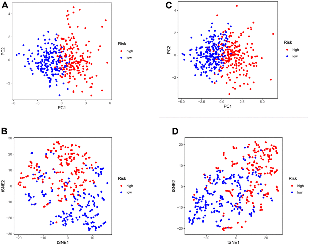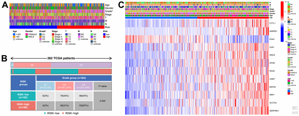 In order to further verify the accuracy of this risk model, we conducted the following analysis to verify it. We first apply PCA and tSNE to analyze whether risk scores can effectively evaluate patient samples. The results of TCGA cohort show that the cases were dispersed clearly, which indicates that the risk score can effectively distinguish these cases (Figure 5A, 5B). Similar results were obtained for validation group data set (Figure 5C, 5D). In the next step, Cox regression analysis combined with clinicopathological data was used to validate the risk score predictive ability of this risk model. The results in Figure 6A and Table 2 show that the risk score was found to be a valid risk prognostic option in the TCGA cohort after both univariate and multivariate Cox regression analyses. Data obtained in Figure 6B and Table 3 support the above view. The ROC was used to evaluate the accuracy and specificity of the predictive value of this model at 1, 3 and 5 years. In the ROC curve constructed by TCGA and GEO data, the AUC values were all >. 0.5 (Figure 6C, 6D). In view of these findings, we intended to delineate the predictive ability of the risk score in more detail, we constructed a risk score clinical heat map by combining the risk score with clinical characteristics. Risk scores were significantly different in Grade staging (Figure 7A). Based on this, we combined the Grade staging data to delineate the risk score in more detail (Figure 7B). The low risk group consisted of 6, 78 and 98 patients in G1, G2 and G3 respectively. The high risk group consisted of 4, 56 and 120 patients in G1, G2 and G3 respectively. Finally, we combined the expression data of the 12 risk genes to create a clinical heat map of risk gene expression (Figure 7C).