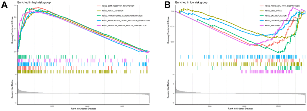 After risk score grouping, a gene set enrichment analysis was performed to provide better understanding of the pathogenesis of the different subgroups of patients. The signalling pathways enriched in the high-risk group were: Ecm Receptor Interaction, Focal Adhesion, Hypertrophic Cardiomyopathy Hcm, Neuroactive Ligand Receptor Interaction, Vascular Smooth Muscle Contraction (Figure 8A). The signalling pathways enriched in the low-risk group were: Aminoacyl Trna Biosynthesis, Cell Cycle, DNA Replication, Oxidative Phosphorylation, Ribosome (Figure 8B).