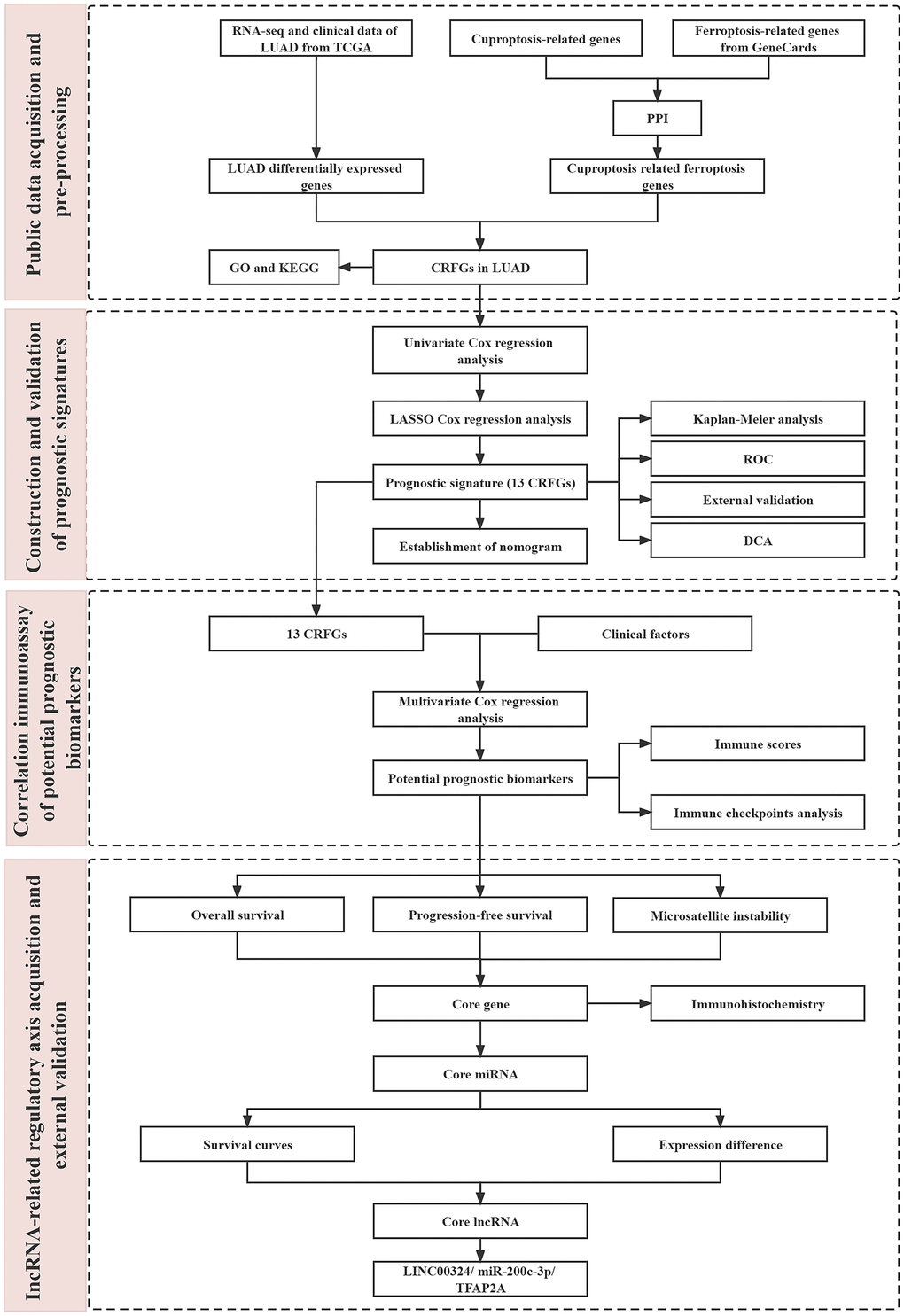 In the present study, we constructed a clinical prediction model about CRFGs in LUAD by bioinformatics using the gene signature of cuproptosis-related ferroptosis as the main object of analysis and validated it using an external dataset for correlation. Based on the model, we established potential prognostic biomarkers. We also further explored the regulatory mechanisms of the two combined death modes by related lncRNA and the potential impact on the prognosis of LUAD. The workflow of this study is shown in Figure 1.