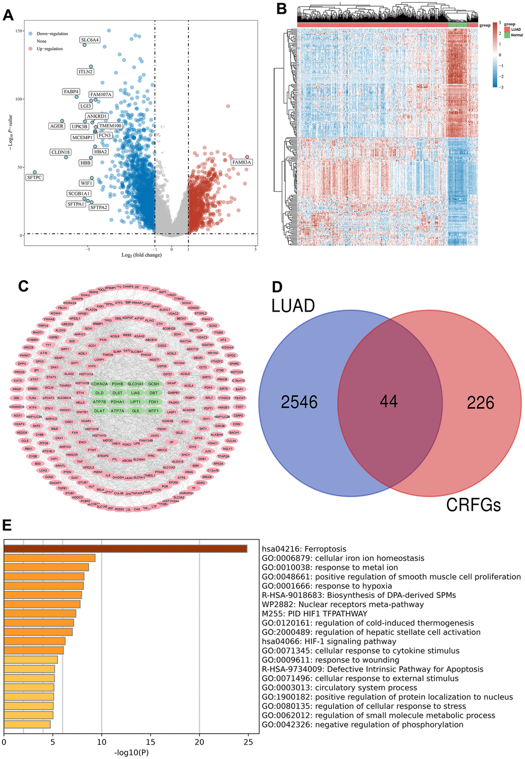The PPI network was constructed from the genes associated with ferroptosis and cuproptosis (Figure 2C), and the network contained a total of 270 nodes with 16 genes associated with cuproptosis and 254 genes associated with ferroptosis. Venn diagrams were plotted for the 2590 differential genes and 270 CRFGs in LUAD, and a total of 44 common genes were found (Figure 2D). The top twenty results with the highest gene enrichment in CRFGs in LUAD are shown in Figure 2E.