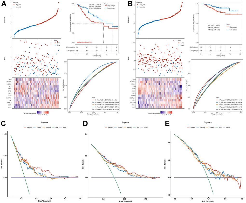To further validate the prognostic performance of our model, two datasets, GSE41271 and GSE31210, were selected in the GEO database as external validation cohorts for the prognostic performance of the model. As shown in Figure 4A, 4B, the validation results of both external cohorts demonstrate the generalizability and reliability of our constructed prognostic signature regarding CRFGs in LUAD. By DCA we found that the prognostic signature associated with CRFGs had better clinical utility compared with other single prognostic signatures for cuproptosis or ferroptosis (Figure 4C–4E).