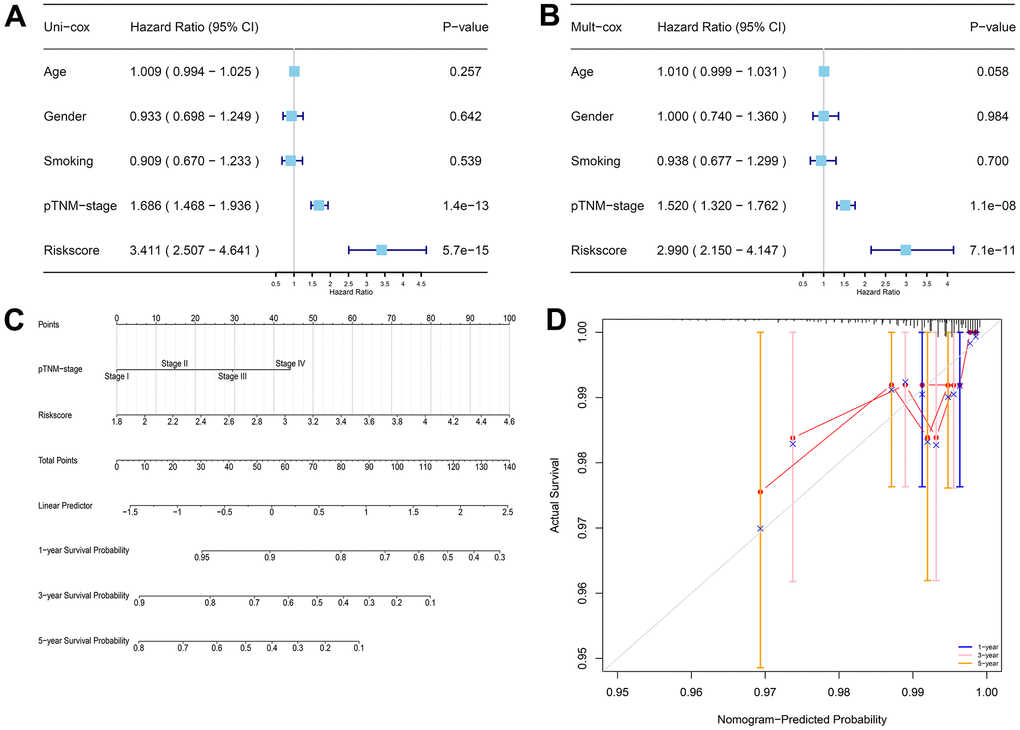 To evaluate the prognostic value of the model, the prognostic signature developed in this experiment and the clinical factors related to LUAD such as age, gender, pTNM-stage, and smoking, were subjected to univariate Cox regression and multivariate Cox regression analyses, and forest plots were constructed using the “forestplot” package in R software. Finally, based on the results of the multivariate Cox proportional risk analysis, the nomogram was constructed using the “rms” package to predict the overall survival (OS) of LUAD patients at 1, 3, and 5 years. The “rmda” R package was then used to build calibration curves and to evaluate the degree of consistency between the OS predicted rate and the actual OS rate by our established nomogram.