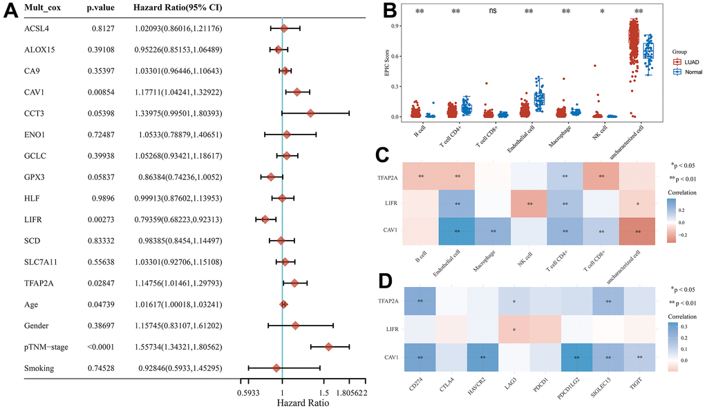 The TME occupies an important position in tumor-related research, and the evaluation of the immune system facilitates the development of personalized immunotherapy strategies for LUAD patients [44]. It has been suggested that the ferroptosis score and cuproptosis-related gene score are important for TME cell infiltration in LUAD patients and assist in assessing the effects of immunotherapy [18, 45]. It was suggested that the degree of intra-tumor infiltration of immune cells and the immune checkpoint correlation could be used for the development of prognostic markers for LUAD [46, 47]. We performed a multivariate Cox regression analysis and found that TFAP2A, CAV1, and LIFR were of greater research potential among the above prognostic biomarkers. Immune infiltration analysis showed that TFAP2A, CAV1, and LIFR were highly correlated with most immune cells in LUAD. Similar findings also pointed out that TFAP2A may act as a transcription factor for SLC7A5 and affect the expression of SLC7A5 in LUAD cells, thus causing alterations in immune-related gene expression and immune cell infiltration [48]. The LIF/LIFR axis could be a valuable clinical target for the regulation of multiple immune cells in TME [49], for example, by affecting the proliferation of CD4(+) and CD25(+) regulatory T cells [50]. The deletion of CAV1, a membrane-intrinsic protein with inhibitory effects on LUAD, in TME may affect the survival of cancer cells [51]. Current studies have shown that CAV1 can act as an immune-related biomarker for LUAD, with positive correlations between different types of immune infiltration [52]. In addition, immune checkpoint blockade (ICB) therapy has been widely used in the treatment of NSCLC [53, 54], and there is an urgent need to find effective biomarkers to identify patients with LUAD who are sensitive to immune checkpoint inhibitors. Our study found that TFAP2A and CAV1 have better responsiveness to common immune checkpoints, providing insight into ICB therapy for LUAD patients.