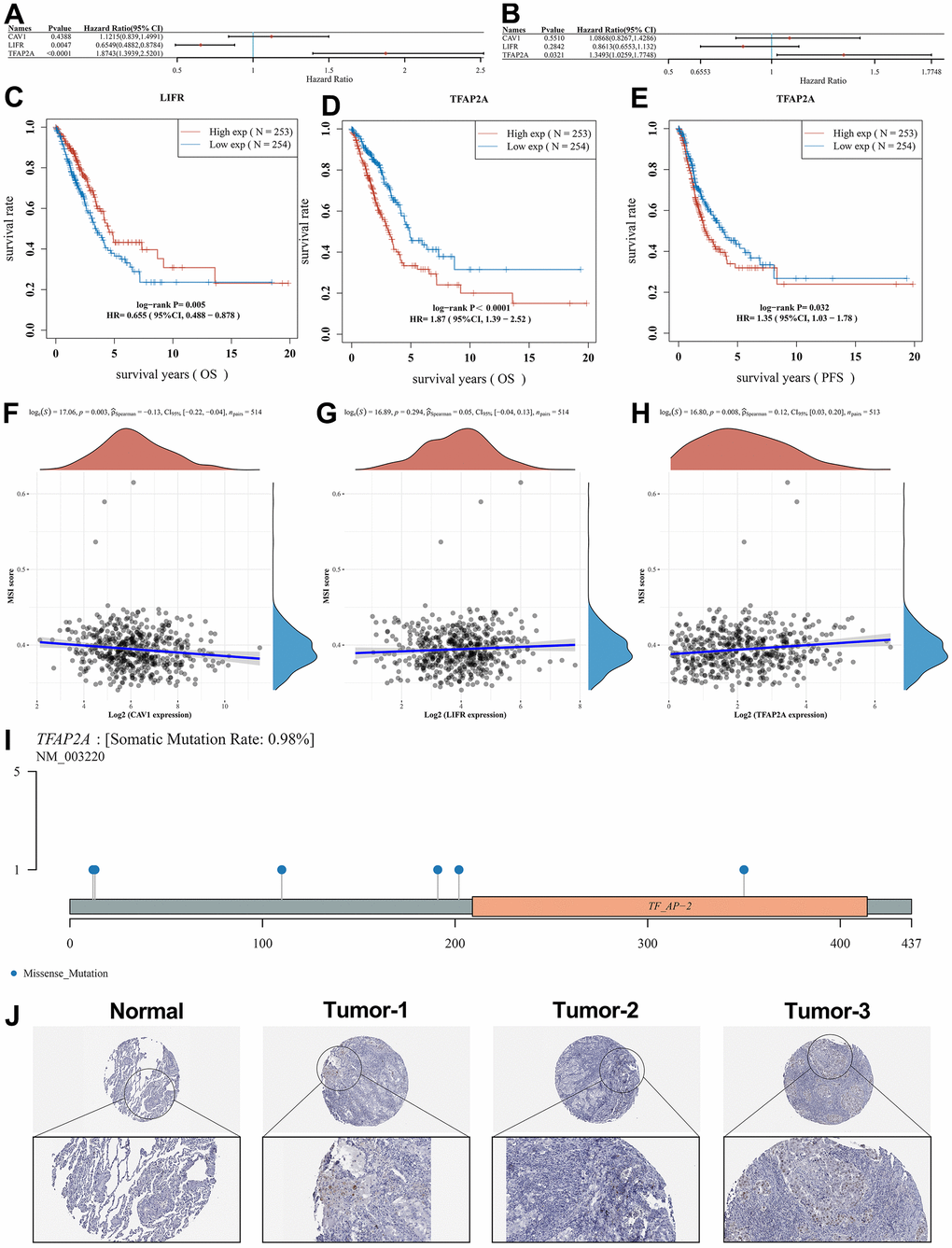 High levels of Microsatellite instability (MSI), which predispose to the accumulation of mutations in cancer and an increase in tumor mutational burden (TMB), are detrimental to the control of cancer progression [25]. In this regard, we performed MSI scores for the three potential prognostic biomarkers. In Figure 7F–7H, it can be seen that CAV1 (p=0.003) and TFAP2A (p=0.008) expression showed a correlation with MSI score whereas LIFR (p=0.294) expression was not significantly correlated with it. Combining the results of the above analysis, we suggest that TFAP2A may act as a core gene and be closely related to the development of LUAD. Figure 7I shows the distribution of gene mutations in the TFAP2A. We also used pathological sections of TFAP2A protein expression to demonstrate core gene-related immunohistochemistry through the HPA database (Figure 7J), and it was seen that TFAP2A expression levels were significantly higher in LUAD tissues compared to normal tissues. These results further validate the upregulation of TFAP2A expression in LUAD tissues.