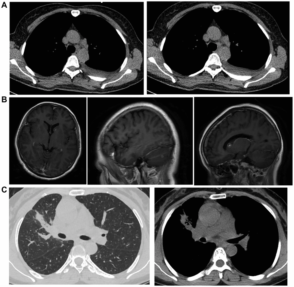 This study recruited 135 patients with brain metastatic lung cancer who were diagnosed with magnetic resonance imaging (MRI) technology (Figure 1) and collected the tissue samples from all of the patients. Genotyping was carried out to determine the genotypes of rs11227209, rs619586, rs664589 and rs3200401 located in MALAT1. The patients were grouped according to their genotypes of MALAT1: 1. CACC (N = 65), 2. GGGT (N = 28), 3. CGCC (N = 16), 4. CAGC (N = 7), 5. GAGT (N = 3), 6. CA (N = 12). The basic characteristics including age at diagnosis, gender, cigarette use history, primary disease history and overall stage of tumor of the patients in the six groups were collected. Then, among all variables, continuous variables were expressed in median, while discrete variables were expressed in the number of cases and percentage. In order to find variables that are linked to the incidence of asymptomatic brain metastasis, SPSS 22.0 (Version number 22.0, IBM, SPSS Inc., Chicago, IL, USA) was utilized. In addition, univariate as well as multivariate logistic regressions were carried out to evaluate the effects of subsequent factors: History of cigarette smoking, largest size of the mediastinal lymph node, and the optimal dissection point for the largest lymph node. Finally, peripheral blood and lung cancer tissue samples were collected from the patients to analyze the expression of target genes. Institutional ethical committee has approved the protocol of this study. Written informed consent was obtained from each patient before the initiation of this study.