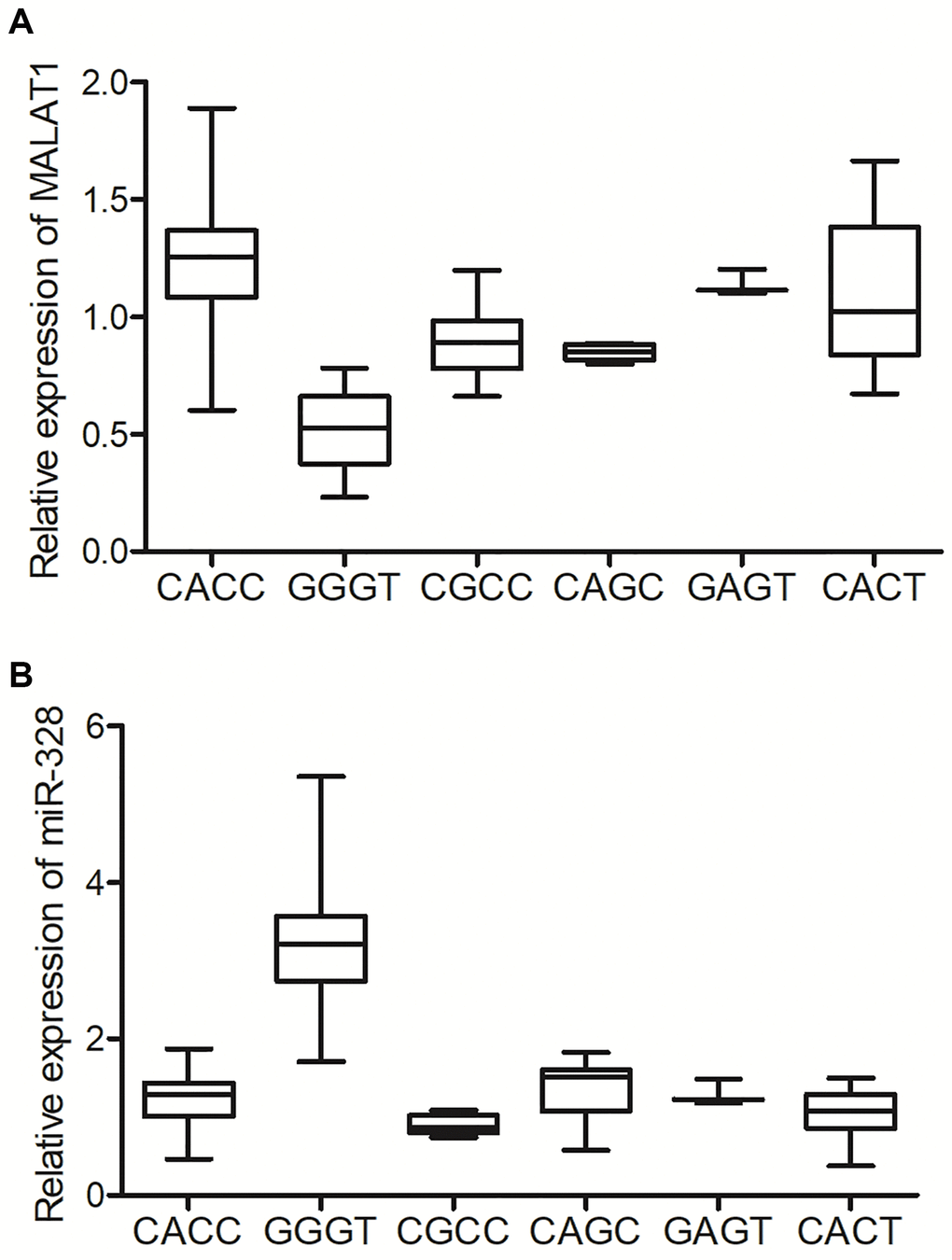 Peripheral blood samples were harvested from patients with different genotypes at rs11227209, rs619586, rs664589 and rs3200401 of MALAT1. Quantitative real-time PCR was performed to examine the expression of MALAT1 and miR-328 in the peripheral blood samples collected from lung cancer patients with different MALAT1 genotypes. The expression of MALAT1 was significantly decreased in the peripheral blood of patients with GGGT genotype when compared with patients with CACC, CGCC, CAGC, GAGT and CA genotypes (Figure 2A). On the contrary, the expression of miR-328 in the peripheral blood of patients with GGGT genotype was remarkably elevated in comparison to patients with other genotypes (Figure 2B).