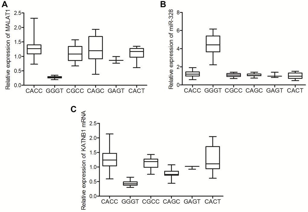 GGGT genotype of MALAT1 was associated with suppressed MALAT1/KATNB1 expression and elevated miR-328 expression in the cancer tissue samples of lung cancer patients