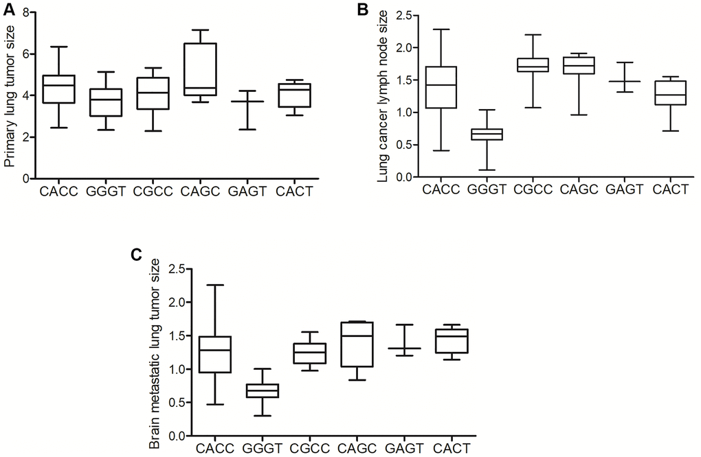 The size of primary lung tumor was observed, and no obvious difference was found in respect to the size of primary lung cancer in patients with different MALAT1 genotypes (Figure 4A). Furthermore, evaluation was carried out to analyze the size of lymph nodes and brain metastatic lung cancer. Significant decrease in the size of lung cancer lymph nodes (Figure 4B) and brain metastatic lung tumors (Figure 4C) was observed in patients with the GGGT genotype in MALAT1 when compared to patients with CACC, CGCC, CAGC, GAGT and CACT genotypes. Compared with the expression of MALAT1 in patients carrying different genotypes (Figure 3A), it can be indicated that the decreased MALAT1 level is associated with the decreased size of lung cancer lymph nodes (Figure 4B) and brain metastatic lung tumors (Figure 4C).