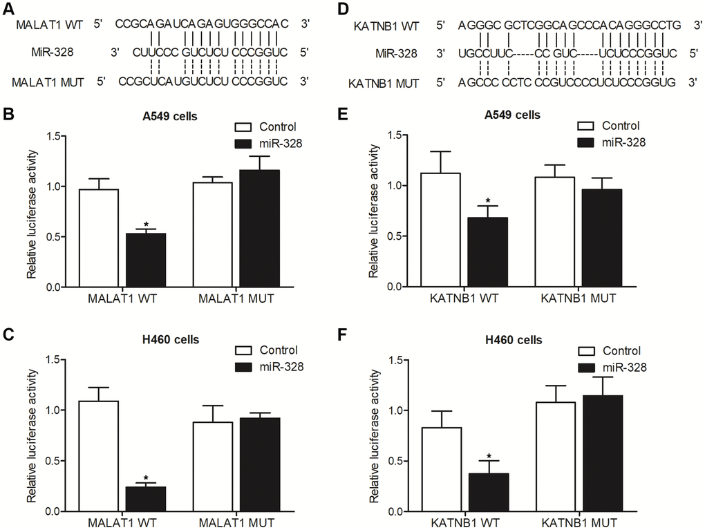 Sequence analysis showed that miR-328 could potentially target MALAT1 (Figure 5A) and the 3′UTR of KATNB1 (Figure 5D). Luciferase vectors containing wild type and mutant MALAT1 and KATNB1 were established and transfected into A549 and H460 cells along with miR-328. The luciferase activities of wild type MALAT1 were remarkably suppressed in A549 (Figure 5B) and H460 (Figure 5C) cells. Meanwhile, the luciferase activities of wild type KATNB1 were notably repressed in A549 (Figure 5E) and H460 (Figure 5F), whereas the luciferase activities of mutant MALAT1 and KATNB1 remained unchanged.
