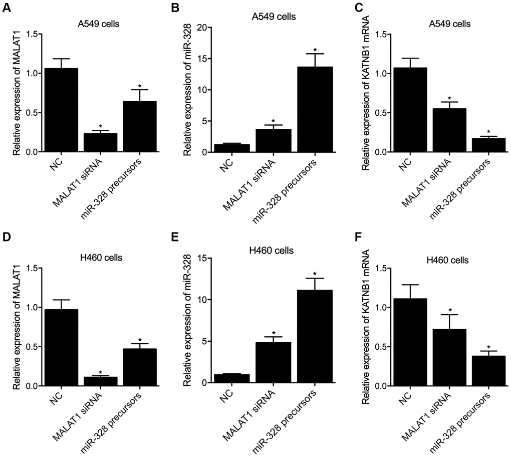 Alteration of MALAT1 and miR-328 expression remarkably affected the expression of KATNB1 mRNA and protein in A549 and H460 cells