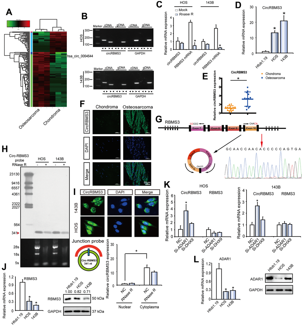 From clinical OS and chondroma tissues, we performed circRNA deep sequencing of ribosomal RNA-depleted total RNA for generating a circRNA-profiling database. The RNA sequencing from three human osteoblastic OS samples and three chondroma tissues was performed by an Illumina Hiseq X Ten. The mapping of the obtained reads was to a ribosomal RNA reference (Bowtie2, http://bowtie-bio.sourceforge.net/bowtie2/) as well as to a reference genome (TopHat2, http://ccb.jhu.edu/software/tophat/) [17, 18]. The extraction and alignment of twenty bases from either end of the unmapped reads were to the reference genome in order to identify distinct anchor positions inside the splice sites. The alignment Anchor reads in the reverse orientation (head-to-tail) demonstrated circRNA splicing and were subsequently submitted to find_circ (https://omictools.com/find-circ-tool) for the circRNAs identification [19]. A candidate circRNA was one that was detected if at minimum one of two distinctive back-spliced reads from a single sample. Identification of 25224 circRNAs was made using this method (Supplementary Figure 1A) [20]. The annotation of the detected candidates was then performed via the RefSeq database [21]. The origination of most circRNAs was from protein-coding exons, whereas other originated from introns, 5’-UTRs, and 3’-UTRs (Supplementary Figure 1B). The majority of detected circRNAs did not exceed 2000 nucleotides (nt) in length (Supplementary Figure 1C). There was a non-significant variation in the chromosomal distribution of detected circRNAs between the OS and chondroma group, whereas there was a downregulation in the circRNAs total expression in the OS group (Supplementary Figure 1D, 1E). Analysis of circRNAs numbers from host genes demonstrated the ability of one gene for multiple circRNAs productions (Supplementary Figure 1F), which accords with prior findings [22]. The circRNAs abundance within a single gene locus (n¼3,687) was investigated. The thick line indicates the median, while the ends of the boxes represent the 25th and 75th centiles, as well as the bars represent the 5th and 95th centiles (Supplementary Figure 1G). This finding indicated the frequently most abundantly expressed circRNA isoform from one gene location. The OS and chondroma groups displayed differential circRNA expression patterns (Figure 1A). Next, the further selection was performed. The identification of the 214 circRNAs differentially expressed in OS and chondroma was performed by RNA-seq mapping to the reference genome (hg38, human genome), with | log2FC(OS/chondroma) | >1, among which 183 circRNAs showed significant overexpression and 31 circRNAs showed significant downregulation. Then, we listed the top 15 significantly upregulated circRNAs in OS and chondroma with log2FC(OS/chondroma) >1 and mean chondroma value > 0 (Supplementary Table 1). We focused on candidates with the most significant differential expression between OS and chondroma groups, then matched them with circbase (http://www.circbase.org/. Among these specific candidates, novel_circ_0064644, listed in the top three upregulated circRNAs in OS, formed by exon 7 circularizing to exon 10 of RBMS3, attracted our attention.