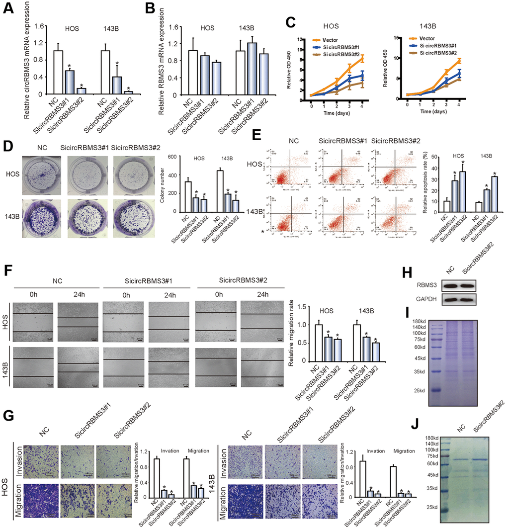For further exploration of the circRBMS3 biological functions, we introduced two circRBMS3-knockdown short interfering (si)-RNAs to target the circRBMS3 junction sites into HOS and 143B OS cells. The circRBMS3 expression showed significant downregulation in siRNA-transfected cells (Figure 2A). Meanwhile, the RBMS3 mRNA expression showed no significant change (Figure 2B). The capabilities of HOS and 143B cells to proliferate and form colonies decreased upon circRBMS3 inhibition (Figure 2C, 2D). The influence of circRBMS3 knockdown on OS cells apoptosis rate was determined via the Flow cytometric analysis. Notably, inhibition of circRBMS3 augmented cellular apoptosis (Figure 2E).