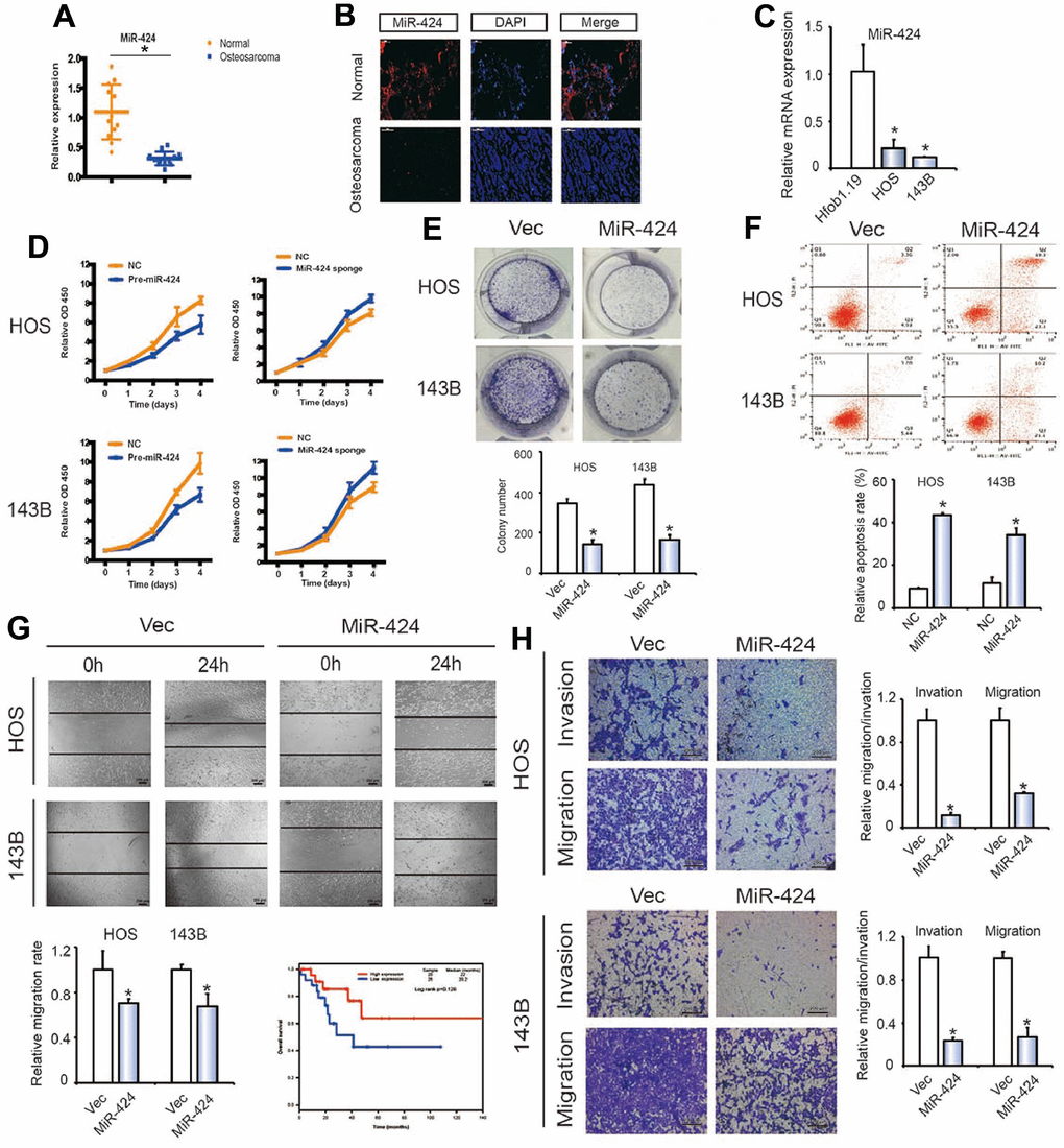 miR-424 suppresses OS cell migration, invasion, and proliferation in vitro