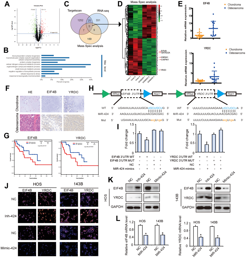 To determine if miR-424 could influence the eIF4B and YRDC expressions, HOS and 143B cells were transfected with miR-424 mimics, suppressors, or respective controls. The results of immunofluorescence (Figure 5J) and western blotting analyses (Figure 5K) showed that miR-424 mimics markedly suppressed eIF4B and YRDC protein levels in OS cells, while the miR-424 inhibitor clearly promoted eIF4B and YRDC protein expression. Moreover, following transfection, there was a similar downregulation in mRNA and protein levels of eIF4B and YRDC (Figure 5L). In summary, these results strongly suggest that miR-424 directly regulates eIF4B and YRDC in OS cell lines.
