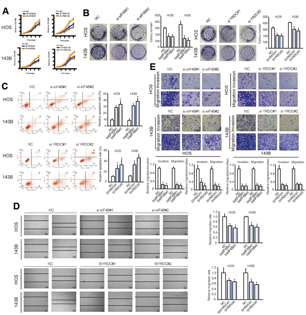 EIF4B and YRDC are known as oncogenes in some tumor types, while their function in OS is currently not understood. We explored the effect of eIF4B and YRDC on OS tumorigenesis by CCK-8 and colony formation experiments. There was a significant reduction in proliferation after inhibition of eIF4B and YRDC expression (*P < 0.05; Figure 6A, 6B). Furthermore, the knockdown of eIF4B and YRDC clearly induced higher levels of apoptosis (Figure 6C, *P < 0.05). In addition, the wound healing (Figure 6D) and transwell assays (Figure 6E) revealed the inhibition of eIF4B and YRDC reduced tumor cells migration and invasion. The above findings suggest that eIF4B and YRDC are tumorigenic and are direct targets of miR-424.