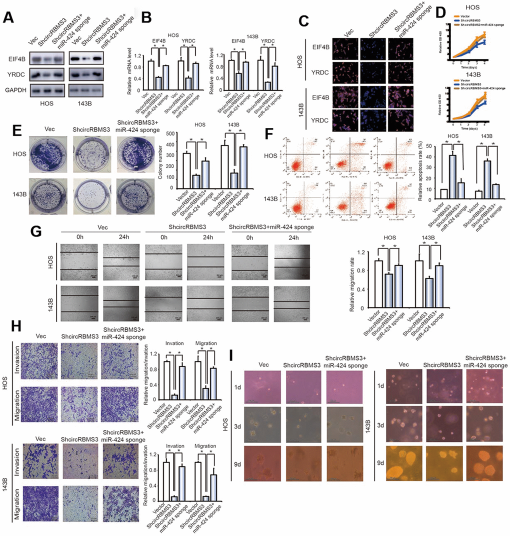 We co-transfected the miR-424 sponge and the circRBMS3 knockdown constructs into OS cells. There was a significant overexpression in protein and mRNA of eIF4B and YRDC in OS cells co-transfected with shcircRBMS3 plasmid and the miR-424 sponge than in cells transfected with shcircRBMS3 alone (Figure 7A, 7B). Immunofluorescence investigation verified the overexpression of eIF4B and YRDC in 143B and HOS cells transfected with shcircRBMS3 and a miR-424 sponge contrasted to shcircRBMS3 alone (Figure 7C). The miR-424 and circRBMS3 knockdown caused a more elevated growth rate than the circRBMS3 suppression group (Figure 7D). The miR-424 and circRBMS3 downregulation enhanced colony formation more than cells transfected with shcircRBMS3 alone (*P < 0.05 for both; Figure 7E). Furthermore, apoptotic cell numbers were decreased after treatment with miR-424 sponge and shcircRBMS3 in co-transfected cells compared with shcircRBMS3 transfected cells (Figure 7F). Furthermore, wound healing assays (Figure 7G) and transwell Matrigel™ invasion experiments (Figure 7H) revealed the enhancement to invasion and migration capabilities caused by OS cells co-transfected with the miR-424 sponge and shcircRBMS3 expression constructs when compared to shcircRBMS3-transfected cells. Strikingly, we observed that inhibition of miR-424 in OS cells significantly strengthened the anchorage-independent growth ability of circRBMS3 knockdown cells (Figure 7I). The findings mentioned above suggested that circRBMS3 increases cell migration, invasion, and proliferation through sponging miR-424 and then stimulates the expression of EIF4B and YRDC in vitro.