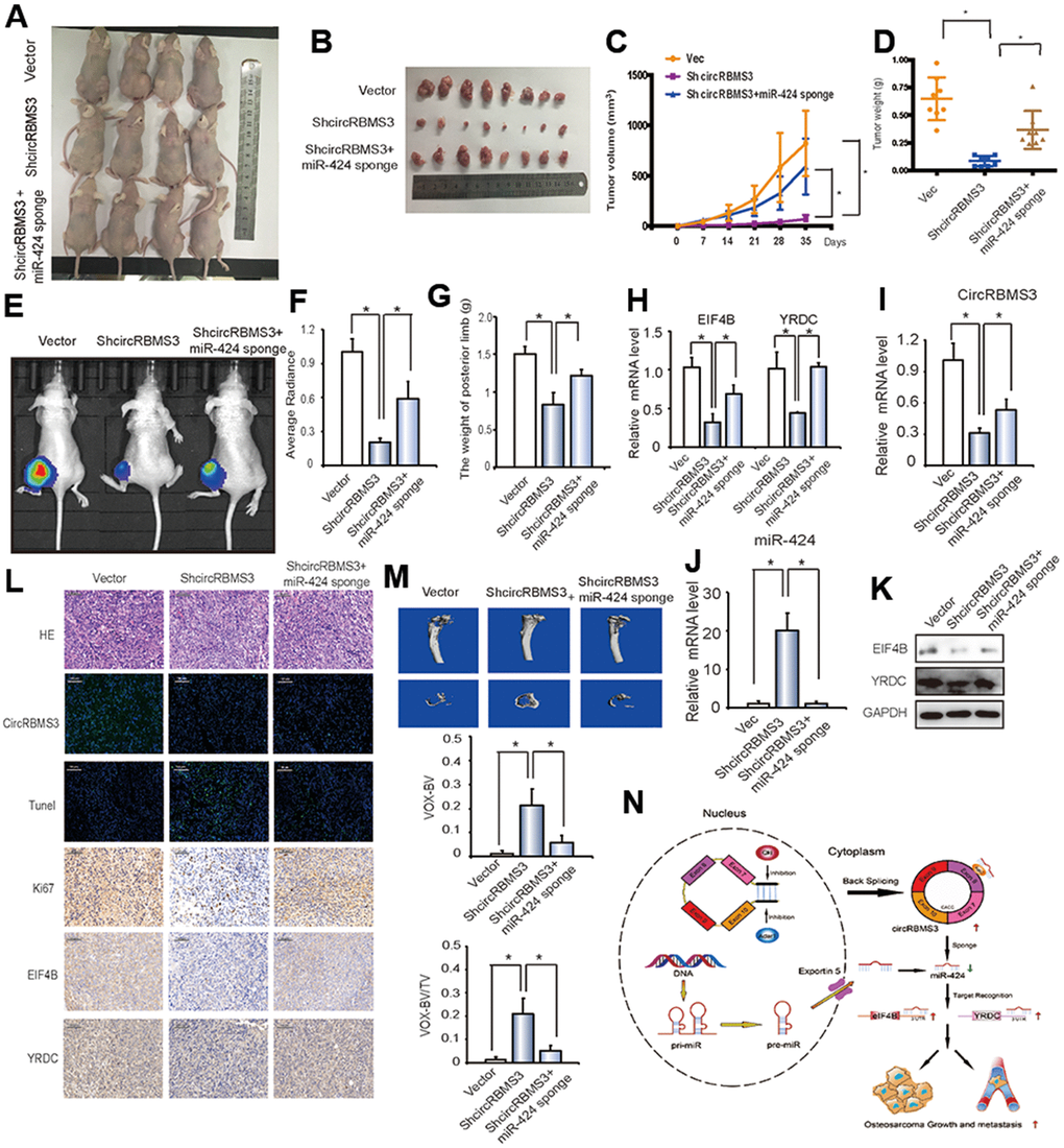 For further evaluation of the circRBMS3 antitumor influence in vivo, we designated an orthotopic OS model by injecting 143B cells intra-tibial. The mice followed intra-tibial injection with circRBMS3-deficient, miR-424 sponge, or stable vector cells. As indicated in Figures 8E, 8F, in vivo imaging data demonstrated the growth inhibition of in situ tumors by the circRBMS3, while mice with tumors lacking both miR-424 and circRBMS3 had a higher tumor size and posterior limb weight (Figure 8G).