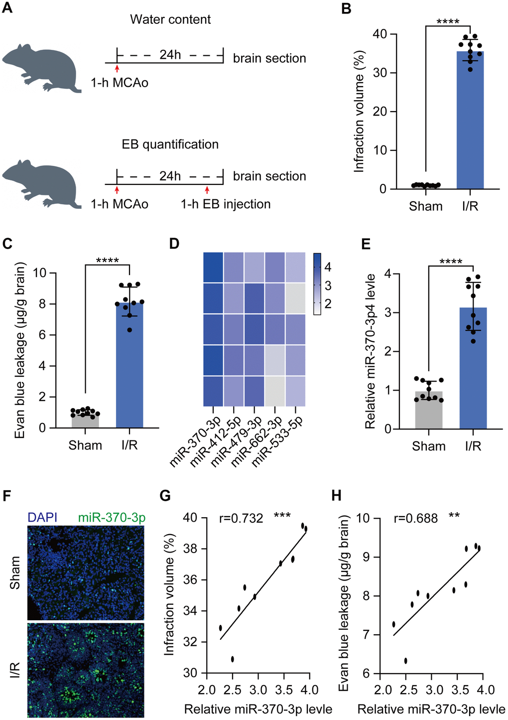 To evaluate the extravasation of blood components into brain parenchyma following BBB disruption, a rat cerebral I/R model was developed and validated in both MCAO-induced ischemic hemispheres and nonischemic hemispheres (sham) (n=10) (Figure 1A). In cerebral I/R rats (n=10), 2 h of ischemia followed by 24 h of reperfusion elicited a cerebral infarction that was statistically significant when compared to sham animals (n=10) (Figure 1B). Before sacrifice, Evan's blue was given intravenously, and water content was assessed 24 hours following 1 hour of acute focal ischemia. This test demonstrated that cerebral I/R rats had a much greater BBB permeability than the control group (Figure 1C). To investigate the underlying processes, RNA sequencing was used to assess the expression profile of miRNA and qRT-PCR to confirm the levels of the miR-370-3p in cerebral I/R rats and matched normal tissue samples (Figure 1D, 1E). According to immunofluorescence images, cerebral I/R tissues displayed higher levels of miR-370-3p than the control group (Figure 1F). These findings suggested that miR-370-3p significantly increased in cerebral I/R rats. Further correlation analysis revealed that miR-370-3p is positively associated with both the magnitude of cerebral infarction and the permeability of the BBB (Figure 1G, 1H). Our findings revealed that miR-370-3p increased in cerebral I/R rats, indicating that it plays a crucial role in controlling BBB permeability after stroke.