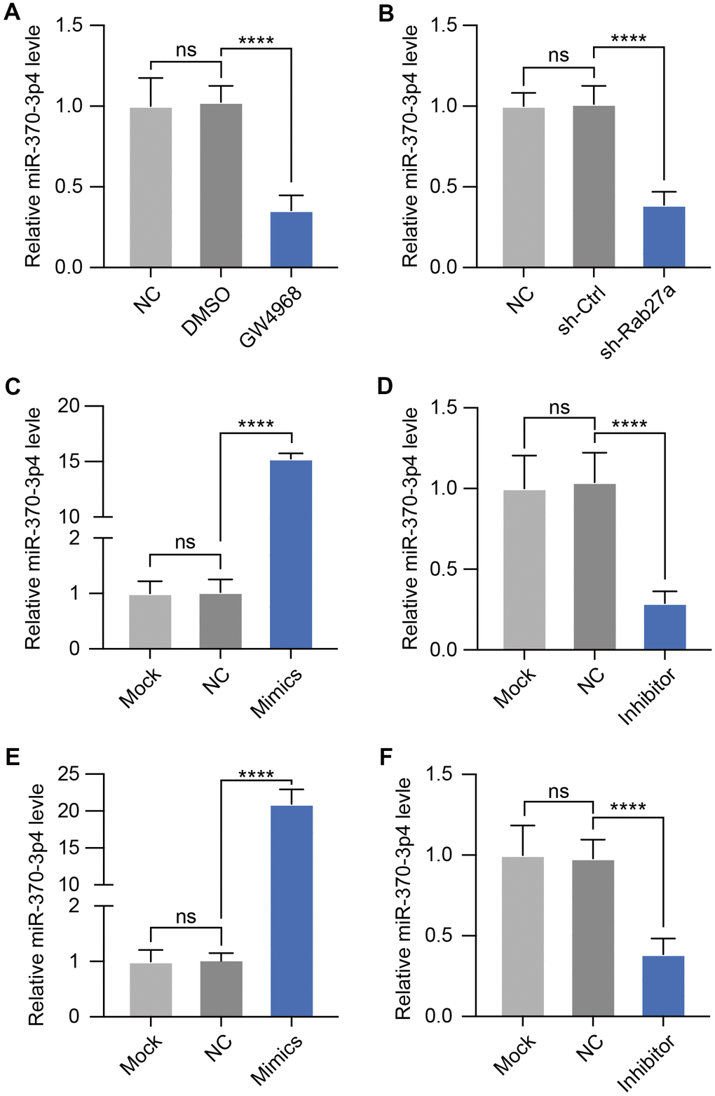 To investigate whether miRNA is transferring in cerebral MVs via exosome transportation, we further treated bEND.3 cells with an exosome inhibitor (GW4968) and then measured the expression of miR-370-3p. qPCR assays revealed that GW4968 significantly decreased miR-370-3p levels in bEND.3 cells (Figure 3A). It has been found that alteration of the Rab27a gene regulates the effectiveness of exosome secretion. Thus, we treated bEND.3 cells with shRab27a for 24 hours showed a substantial decrease in miR-370-3p (Figure 3B). Then, we assessed levels of miR-370-3p inside bEND.3 after miR-370-3p mimic or inhibitor treatment and discovered that miR-370-3p mimic therapy significantly increased the expression of this miRNA within these cells, and inhibitor down-regulated miR-370-3p (Figure 3C, 3D). The levels of miR-370-3p within exosomes derived from MVs of cerebral I/R rats were also assessed by qPCR following miR-370-3p mimic or inhibitor treatment (Figure 3E, 3F). These results indicated that cerebral MVs derived miR-370-3p are primarily delivered through exosome-mediated mechanisms.