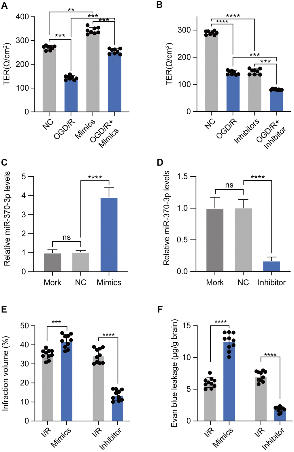 To explore the roles of miR-370-3p in BBB disruption of brain endothelial cells, transendothelial electrical resistance was used to evaluate BBB integrity in bEND.3 cells. Inhibition of miR-370-3p effectively reduced the transendothelial electrical resistance value of bEND.3 cells during OGD/R (Figure 4A). Consistently, overexpression of miR-370-3p could enhance the transendothelial electrical resistance value during OGD/R (Figure 4B). These findings suggested that OGD/R, at least in part, caused BBB disruption by suppressing miR-370-3p. In vivo, pre-NC, miR-370-3p mimics or inhibitors were utilized to regulate the levels of miR-370-3p in MVs As expected, transfection of miR-370-3p mimics elevated the expression level of miR-370-3p and inhibitors significantly inhibited the expression level of miR-370-3p (Figure 4C, 4D). Overexpression of miR-370-3p increased the BBB infarct volume of cerebral I/R rats (n=10), and inhibiting miR-370-3p reduced the infarct volume (n=10) (Figure 4E). Additionally, BBB permeability of cerebral I/R rats markedly increased after receiving miR-370-3p mimics. In contrast, BBB permeability decreased in cerebral I/R rats after receiving miR-370-3p inhibitors (Figure 4F). Together, these results showed that miR-370-3p overexpression exacerbates I/R-induced BBB disruption while miR-370-3p inhibition reduces it.