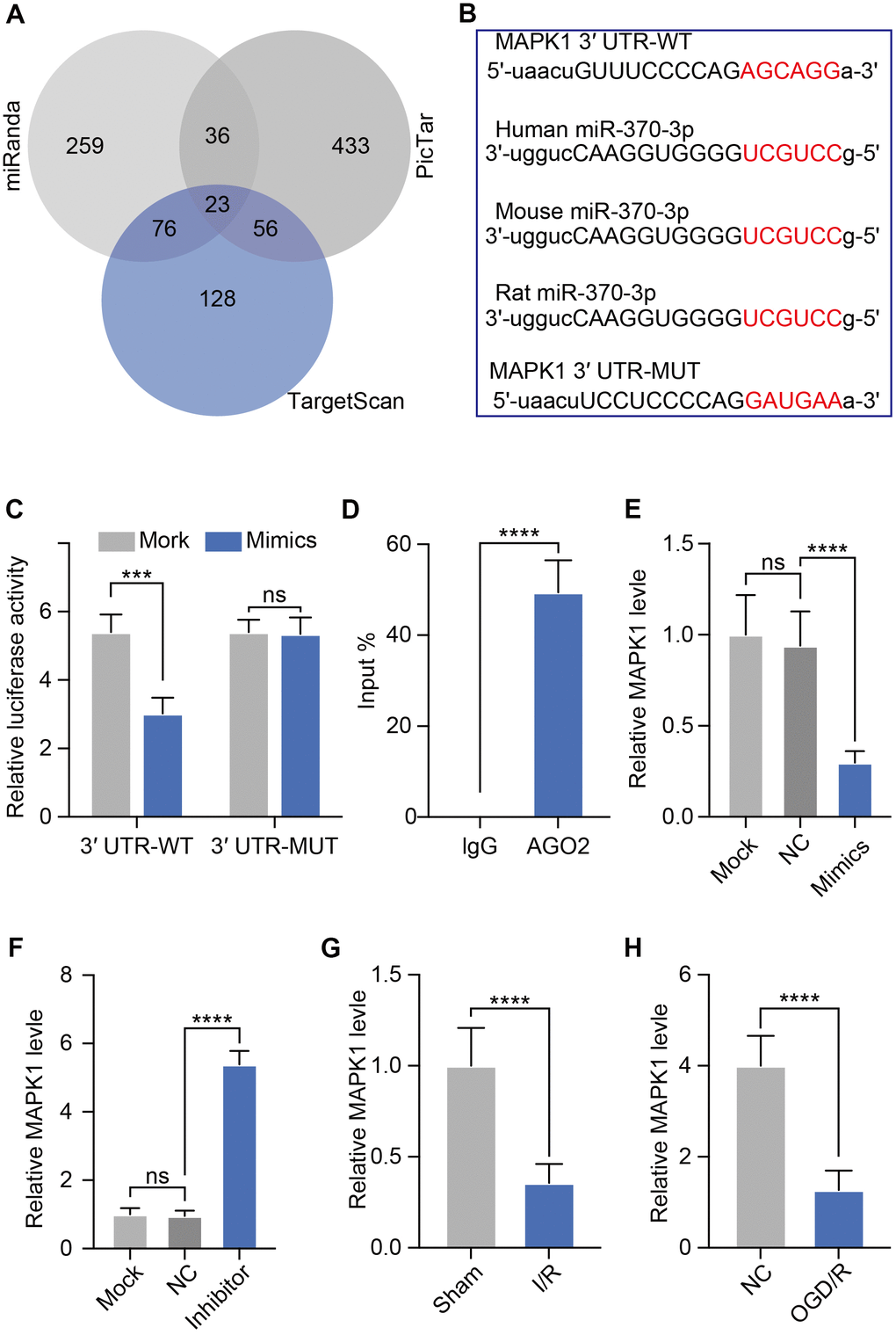 We next used bioinformatics analysis to identify possible targets of miR-370-3p in order to understand the processes by which this miRNA may affect BBB of I/R development. The potential miR-370-3p target genes were predicted using the TargetScan, PicTar, and MiRanda databases. There were 23 target genes in the intersection of these three databases, as seen in the Venn diagram (Figure 5A). MAPK1 was chosen as a possible target of miR-370-3p by considering differential expression, pathways, and literature. We also found that various MAPK1 sequences of different species were homologous. A candidate miR-370-3p binding site was identified within the MAPK1 3′-UTR (Figure 5B). We next designed luciferase vectors containing WT or mutant (MUT) copies of the MAPK1 3′-UTR region to validate the capacity of miR-370-3p in the regulation of MAPK1 expression. Co-transfection of miR-370-3p mimics and MAPK1 plasmids reduced luciferase activity in the WT group but not in the MUT group (Figure 5C). Additionally, co-precipitation of miR-370-3p with MAPK1 was validated by RIP studies, indicating a strong interaction between these two targets (Figure 5D). These results, therefore, supported that miR-370-3p directly suppresses MAPK1 expression in a sequence-specific manner. To further confirm the regulatory relationship between miR-370-3p and MAPK1 in bEND.3 cells, we treated bEND.3 cells with miR-370-3p inhibitor or miR-370-3p mimics. The results showed that miR-370-3p inhibitor significantly increased MAPK1 and miR-370-3p mimics decreased MAPK1 in bEND.3 cells (Figure 5E, 5F). These results thus validated MAPK1 as a miR-370-3p target gene. Furthermore, we assessed the level of MAPK1 using qPCR and discovered that it was elevated in both cerebral I/R rats and OGD/R in bEND.3 cells (Figure 5G, 5H).