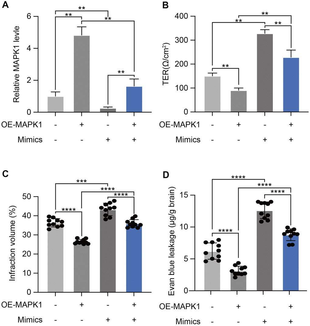 We next carried out rescue evaluations to determine the degree to which miR-370-3p-mediated MAPK1 down-regulation increases I/R-Induced BBB breakdown. MAPK1 levels were tested by qPCR in bEND.3 cells after miR-370-3p mimics and OE-MAPK co-transfection. The results showed that MAPK1 was up-regulated relative to the levels observed in cells with miR-370-3p mimics co-transfection and negative control (Figure 6A). Transendothelial electrical resistance measurements showed that MAPK1 overexpression prevented BBB breakdown, which was caused by miR-370-3p (Figure 6B). By co-transfecting with miR-370-3p mimics and either OE-MAPK1 or NC lentivirus, we were able to assess the effects of miR-370-3p and MAPK1 in vivo. In the MVs of cerebral I/R rats (n=10), MAPK1 overexpression decreased infarct volume and BBB permeability, whereas miR-370-3p mimics co-transfection reversed these effects (Figure 6C, 6D). These results supported the hypothesis that MAPK1 is a direct miR-370-3p target gene that causes a worsening BBB disruption during cerebral I/R.