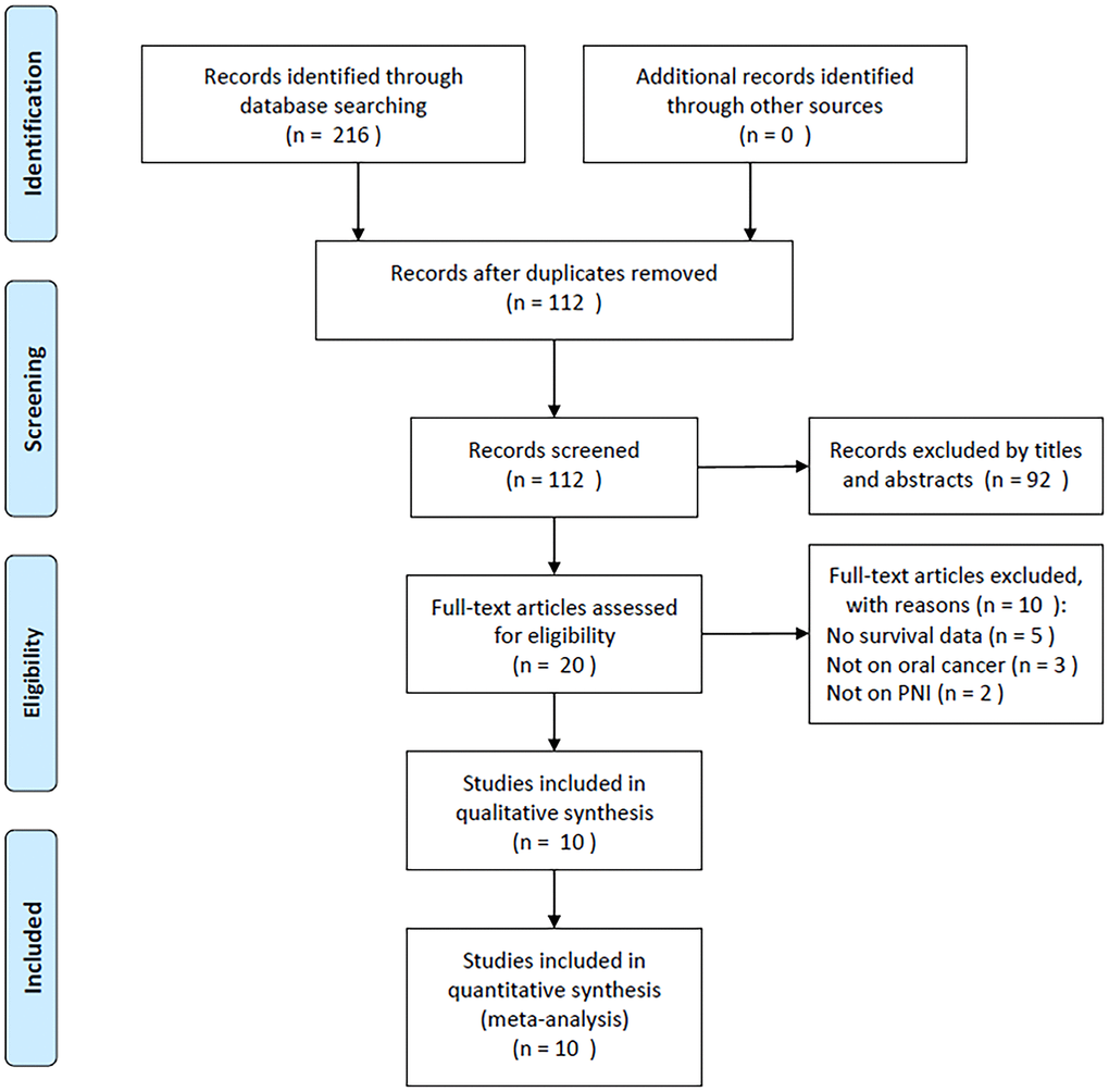 As shown in Figure 1, the number of records identified by initial literature retrieval totaled 216 and following elimination of duplicate items, 112 studies were retained for subsequent examination. Through abstract and title screening, ninety-two articles were excluded, while the remaining 20 studies were evaluated via full-text reading. Subsequently, 10 of them were discarded due to the fact that no survival data provided (n=5), not on oral cancer (n=3), and not reported on PNI (n=2). Finally, ten studies with 3,130 patients [12, 13, 20–27] were enrolled in the present meta-analysis (Figure 1).