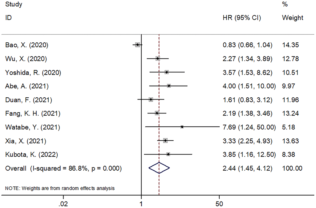 PNI was reported to be prognostically significant for OS of oral cancer in 9 studies involving 3,027 patients [12, 13, 20, 22–27]. We adopted a random-effects model since the heterogeneity was significant (I2=86.8%, Ph=0.000; Table 2 and Figure 2). As indicated by the pooled results of HR=2.44, 95%CI=1.45–4.12, p=0.001, a low PNI was linked significantly to inferior OS in oral cancer. We further performed subgroup analysis, as shown in Table 2, a low PNI was still a significant OS biomarker independent of study center, sample size, TNM stage, type of survival analysis, cut-off value, or method for threshold identification.