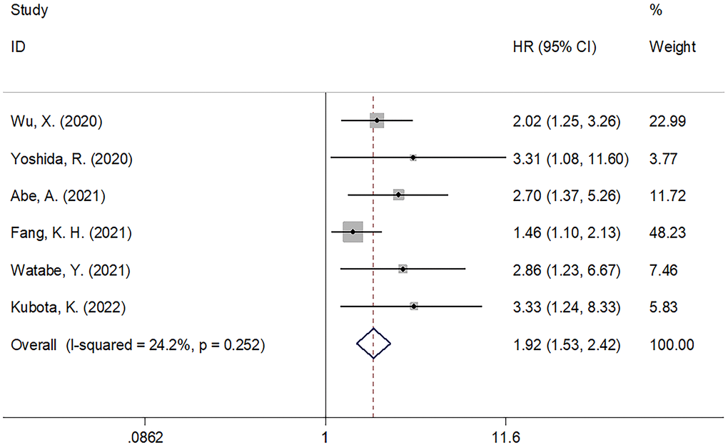 | Total | 6 | 1,135 | Fixed | 1.92(1.53-2.42) | <0.001 | 24.2 | 0.252 | ||||||||||||||||||||||||||||||||||||||||||||||||||||||||||||||||||||||||||||||||||||||||||||