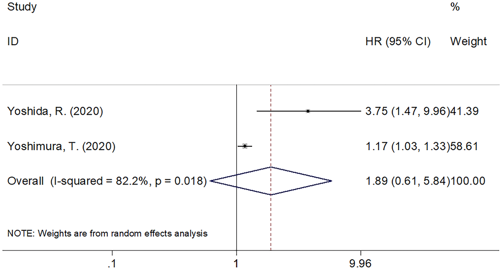 Six studies with 1,135 patients [13, 20, 22, 24, 25, 27] provided the data on PNI and DFS for the oral carcinoma population. Since the heterogeneity (I2=24.2, Ph=0.252) was insignificant, we chose a fixed-effects model. As displayed in Table 3 plus Figure 3, the pooled HR was 1.92, while the 95% CIs were 1.53–2.42 (p<0.001), suggesting that a low PNI was connected to shortened DFS in oral cancer. As implied by subgroup analysis, a low PNI was still a significant DFS predictor in various subgroups of sample size, cancer type, study center, geographical locations, TNM stage, treatment method, threshold and method for identifying threshold (Table 3). Two studies including 150 patients [20, 21] analyzed PNI’s prognostic value for CSS. According to Figure 4, the pooled data revealed insignificant correlation of PNI with CSS in oral carcinoma (HR=1.89, 95%CI=0.61–5.84, p=0.267).