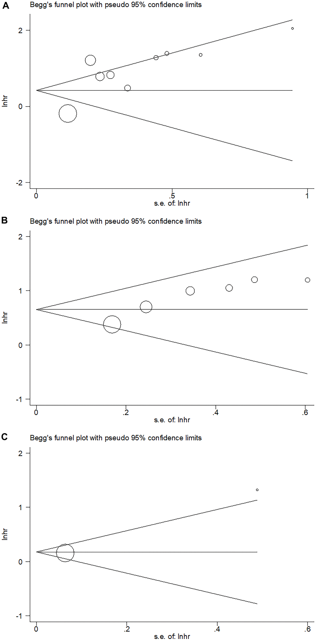 Publication bias was assessed through Begg’s test combined with Funnel plotting. As shown in Figure 6, p values of Begg’s test for OS, DFS, and CSS were 0.602, 0.260, and 0.317, respectively. The funnel plots were symmetrical and the evidence of publication bias was absent in the current meta-analysis.