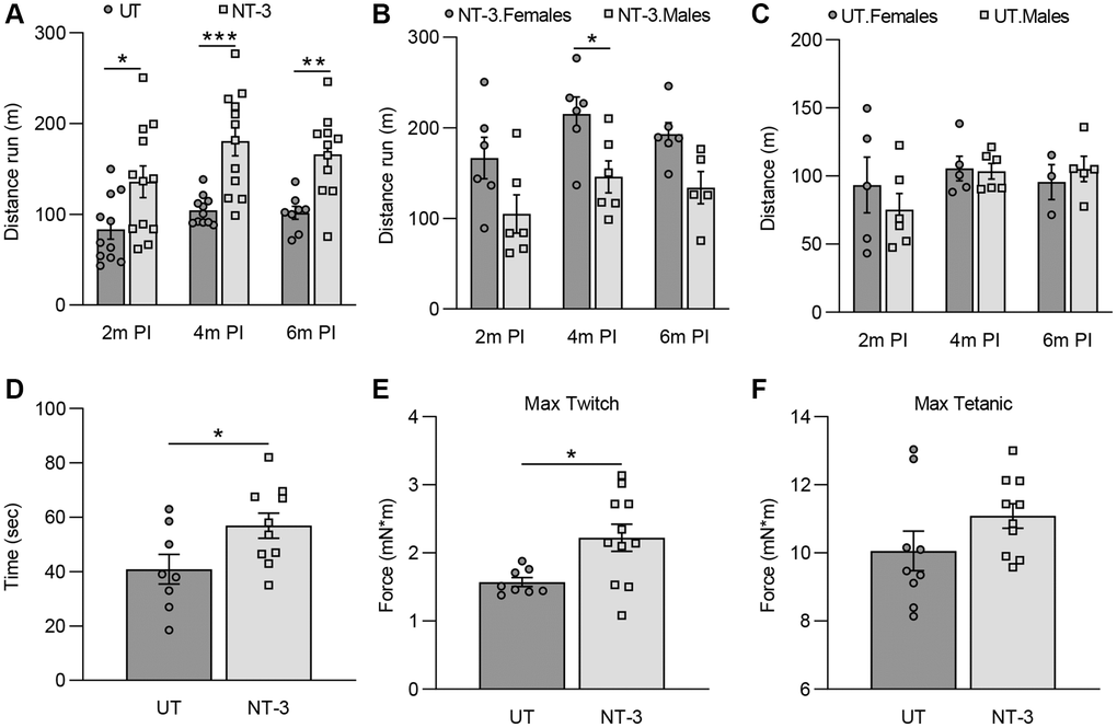 Run to exhaustion treadmill performance test was performed at two-, four- and six-months post injection. Mice were exercised to exhaustion via treadmill (Columbus Instruments, Exer-6M Treadmill), as described previously [15]. Mice were acclimated to the treadmill prior to data collection. Mice were run to exhaustion with increasing treadmill speed by 1 meter/min each minute, starting at an initial 7 meter per minute velocity. Lanes have a shock plate that pulses at a frequency of ~3 Hz. Mice were considered at “exhaustion” level when they were unable to re-engage the treadmill for 3 seconds after resting on the shock-plate. Run duration was recorded and used to calculate the distance ran (2 months post-injection: NT-3, n = 12; UT, n = 11; 4 months post-injection, NT-3, n = 12; UT, n = 11; 6 months post-injection: NT-3, n = 11; UT, n = 8).