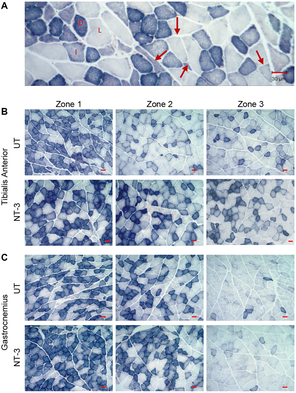 Total RNA was extracted from frozen muscle blocks (20 micrometer thick sections, 20 section per block; NT-3, n = 9; UT, n = 8; WT, n = 8) using Mini RNeasy Plus Universal Kit (Qiagen). cDNAs were synthesized using ProtoScript II First Strand cDNA Synthesis Kit (BioLabs). Primer sets (synthesized by IDT) for Pgc-1α, Cox1, Cox3 and Atp5d were obtained from previous publications [52–54] and new primers were designed for Pfkm (F-GAAGATACCAACTCGGACCAC, R-ATGACCCATGAAGAGCATCA) and Hk-1 genes (F-CGGAATGGGGAGCCTTTGG, R-GCCTTCCTTATCCGTTTCAATGG). All qPCR were performed using PowerUp SYBR Green Master Mix (ThermoFisher) according to the manufacturer’s instructions. qPCR assays were performed using QuantStudio 6 Flex (Applied Biosystem). Expression data were normalized to mouse Gapdh mRNA level and data were analyzed by ΔΔCt method.