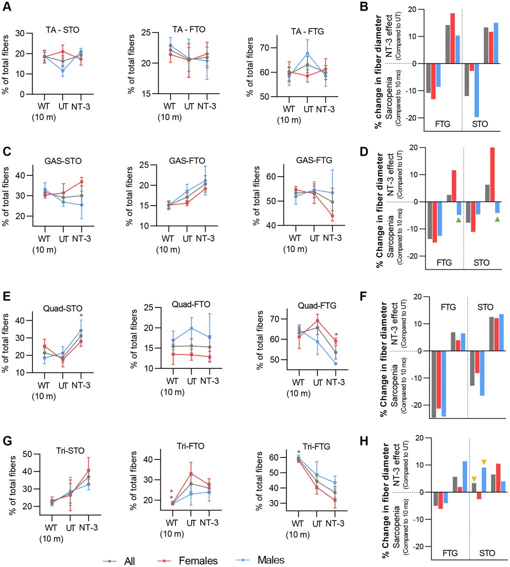 In the untreated C57BL/6 mice, detailed morphometric data from all four muscles, although confirmed the previous observations of type 2 fiber atrophy in general [24–26], revealed some differences between muscles in response to aging process. The most severe glycolytic fiber atrophy occurred in both male and female quadriceps, and the most severe oxidative fiber atrophy was present in male tibialis anterior muscles; triceps were the least affected muscle by sarcopenia. At 6 months post NT-3 gene therapy, quantitative data from all four muscles revealed an overall normalization of fiber size towards values observed in 10 months of age. In the quadriceps and triceps (proximal-extensor muscles) of the treated aged cohort, there was a switch to fatigue-resistant oxidative fibers occurred in both sexes, when compared to untreated. However, in distal hindlimb muscles (anterior compartment/flexor muscle vs. posterior compartment/extensor muscle), we found what appears to be a sex-dependent muscle remodeling. The switch from oxidative to glycolytic fiber type observed in the tibialis anterior muscle in females was associated with prominent FTG size increase. In the same muscle from males, oxidative fiber size increase was greater than glycolytic, along with an increase in oxidative fiber type. Contrary to the tibialis anterior, in the female gastrocnemius muscle, there was a switch from glycolytic to oxidative fiber type, in addition to a prominent STO size increase. We were intrigued with these observations that the most prominent muscle fiber size increase occurred in the direction of fiber type switch; to oxidative vs. to glycolytic. Interestingly however, male gastrocnemius muscle failed to show any size increase in STO or FTG, while a small FTO percentage gain was detected along in addition to a meager size increase in this fiber subtype. Overall, these observations show the presence of a muscle- and sex-dependent remodeling with aging, as well as response to NT-3 treatment.