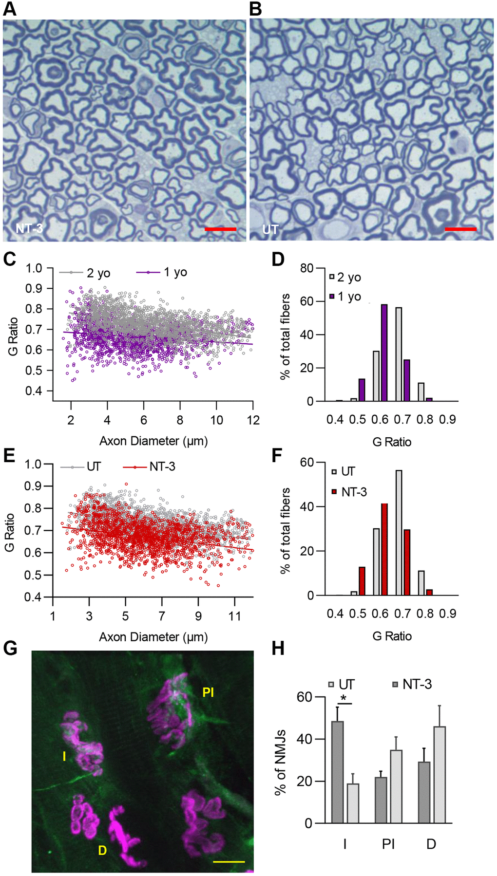 G ratio was calculated to assess the myelin thickness of fibers in tibialis nerve, as described previously [48]. Semithin, toluidine blue-stained cross sections of tibial nerve were prepared for each mouse (n = 6 for both treated and untreated 2-year-old mice, n = 4 for 1-year-old control mice, with even sex distribution) and three randomly selected nonoverlapping areas were photographed randomly at 100× magnification using an Olympus BX41 microscope and SPOT Insight 12Mp sCMOS camera. Myelin interior and exteriors were outlined in Axiovision (AxioVs40 × 64 V 4.9.1.0) to determine the area, which was used to calculate diameters to determine g ratio. A total of 1833 fibers for treated, 1928 for untreated and 1658 for 1-year-old control mice were measured to generate scattergrams and the percent g ratio distribution histograms. Slopes of treated vs. untreated and 1-year-old vs. 2-year-old mice were compared using GraphPad Prism (9.0.0).