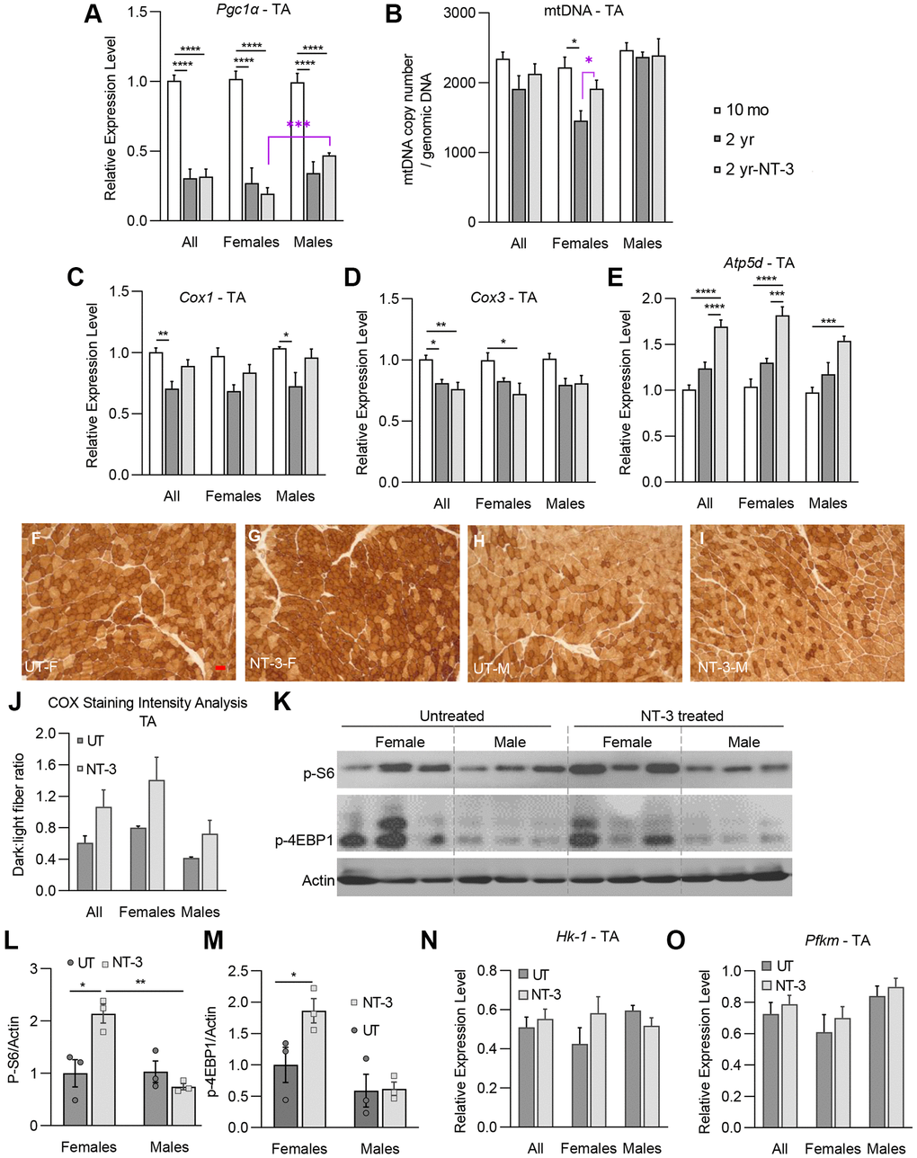 Studies have shown that mtDNA and mRNA abundance and mitochondrial ATP production, all decline with advancing age [21]. PGC1α is an important transcriptional coactivator of mitochondrial biogenesis and respiration [28]. Previous studies have shown that PGC1α drives the formation of fatigue resistant STO muscle fibers [29]. Decreased Pgc1α expression in sarcopenic muscle from old rodents has been reported [30], as well as with aging in sedentary persons compared with physically active individuals [31, 32]. Recent transcriptomic data from skeletal muscle found reduced expression of genes related to all electron transport complexes and pyruvate dehydrogenase complexes with aging in humans [33]. Our molecular studies from untreated aged C57BL/6 mice agree with these previous reports by showing decreased Pgc1α expression and mtDNA content as well as reduced Cox1 and Cox3 transcripts compared to 10-month-old muscle. Lack of Pgc1α increase at 6 months post gene injection, although seemingly not fitting with the finding of increased mitochondria content in female tibialis, might be explained with the possibility of Pgc1α activation in an earlier time point followed by an equilibrium state. In a previous study of NT-3 gene therapy in young male trembler J (TrJ) mice, at 4 months post AAV.NT-3 injection we found increased Pgc1α expression, accompanied by increased phosphorylation levels of 4E-BP1 and S6 proteins as evidence of mTORC1 activation in the gastrocnemius muscle [9]. AAV.NT-3 treatment was capable of reversing the defective expression levels of Pgc1α seen in the TrJ neurogenic muscle along with enhanced levels of activated 4E-BP1. In the skeletal muscle, mTORC1 can regulate mitochondrial biogenesis and metabolism through 4E-BP1/PGC1α [34]. Therefore, it is conceivable that NT-3 might also promote oxidative phosphorylation through activation of 4E-BP1 and PGC1α in the muscle. PGC1α is known to co-regulate several genes, and its expression alone is considered sufficient to increase mitochondrial mass [35]; however, it was also reported that PGC1α is dispensable for exercise induced mitochondrial biogenesis in skeletal muscle [36]. Therefore, further studies are needed to assess the link between NT-3 and Pgc1α expression in the sarcopenic muscle, including earlier time point experiments in this model.