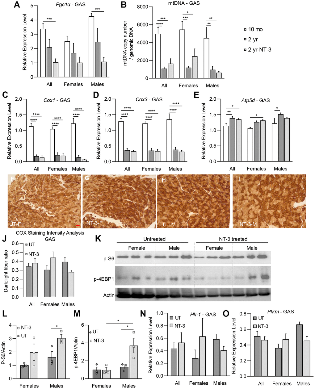 The results from the molecular studies assessing the NT-3 effect on the oxidative state of distal hind limb muscles, accompanied by western blot analyses for mTORC1 activation are in accordance with the histologic findings. We like to emphasize here that NT-3 effect is not directed to well-differentiated or normal functioning cells, but rather is operative upon remodeled-cell metabolism that may result from a pathological process [9, 27]. In this context, it is not surprising to see NT-3, through mTORC1 activation, exerts an anabolic effect in the female tibialis anterior by increasing FTG fiber size and the percentage of glycolytic fibers, and by doing so, overcoming the age-related remodeling by normalizing the muscle towards to a younger age. Even though Pgc1α transcripts at this time point was found not elevated, we showed evidence that NT-3 prevented the age-related mitochondria loss by increasing mitochondria copy number towards 10-month levels. This was associated with significantly increased Atp5d transcripts and COX stain intensity, suggesting increased mitochondrial function. Decreased Pgc1α levels can be interpreted as correlative of decreased STO percentage, which was also associated with an increase in FTG percentage along with a significant size increase of FTG fibers. We believe that the total mtDNA increase in tissue might be linked to these changes in FTG subtype. In contrast, NT-3 in male tibialis anterior showed no mTORC1 activation, but preserved mitochondria content and function. This was supported by an increase in Pgc1α and Atp5d transcripts as well as COX stain intensity, which was reflected in muscle histology as fiber type switch from glycolytic, back to the oxidative levels, as in the 10-month-old samples. The findings in gastrocnemius, when contrasted with tibialis anterior muscle, appear unique, as males were less responsive to NT-3. Even though with treatment, mTORC1 was activated, the male gastrocnemius muscle failed to respond with size increase in any of the fiber types. NT-3 also did not alter mitochondria copy number, or markers of oxidative phosphorylation expression significantly. In female gastrocnemius, although did not reach to significance level (likely due to small n number), NT-3 lead to some increases in the phosphorylated S6 protein, as well as in mitochondria content, which were associated with STO greater than FTG fiber size increase, along with increased STO percentage.