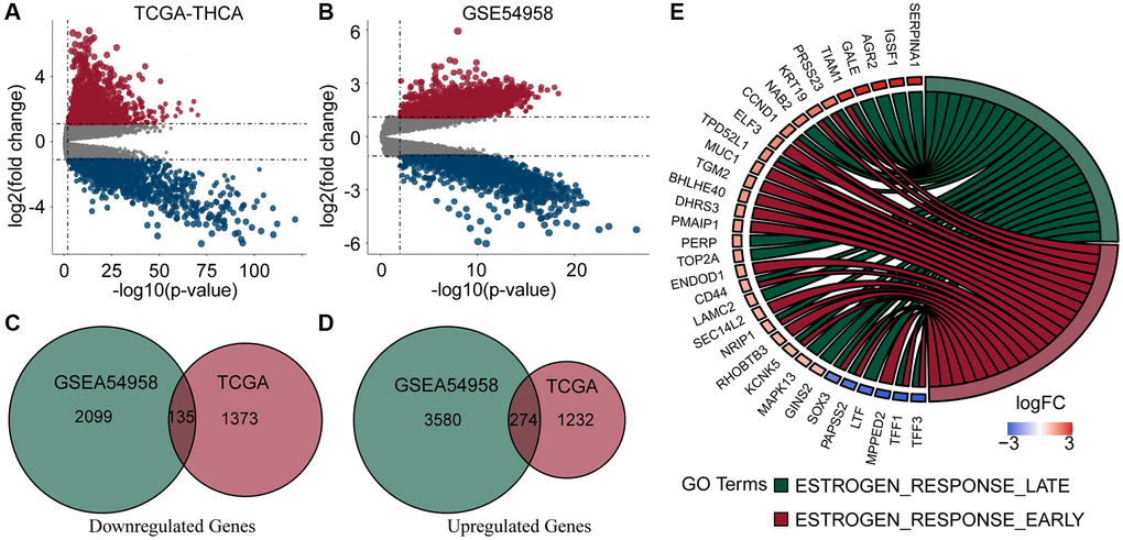We downloaded complete clinical sequencing data for 501 thyroid cancer tissues and 58 normal tissues from the TCGA database. In addition, 25 TC tissues and 7 normal tissues were obtained from the GSE54958 dataset. Differential expression and Venn analyses identified 274 genes upregulated and 135 genes downregulated in both datasets (Figure 1A–1D). Finally, an enrichment analysis of these genes revealed that they were mainly enriched in estrogen response-related pathways (Figure 1E).