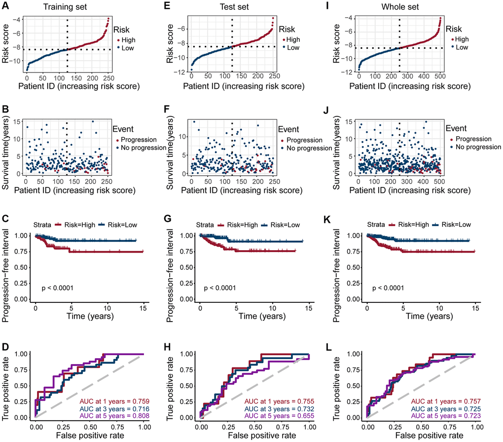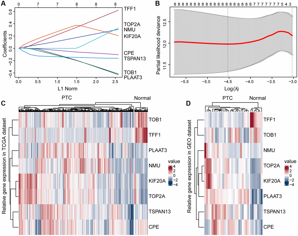 The whole set with complete clinical information were equally divided into training and test sets using the R package caret. The R survival package was used to perform univariate Cox regression analysis, and the R glmnet package was used to perform lasso Cox regression analysis. The estrogen response-related DEGs with a significant prognostic value (p < 0.05) were screened. We constructed a risk model based on the screened prognostic genes, risk score = (coefficient gene 1 × gene 1 expression) + (coefficient gene 2 × gene 2 expression) + (coefficient gene N × gene N expression), where the coefficient was from the univariate Cox regression analysis of the training set. Patients were divided into a high-risk score group and a low-risk score group, depending on the median value of the risk score. The difference in survival between the two groups was assessed with Kaplan-Meier (K-M) survival curves and compared by the log-rank test. Time-dependent ROC curves for PFI of 1, 3, and 5 years were constructed, and AUC values were calculated to assess the accuracy of the prognostic model. Then a heatmap was also created based on the expression of eight genes in the TCGA and GSE54958 datasets between the PTC and normal tissues.