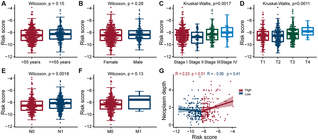 Data analysis was performed by using GraphPad Prism 9.0 (San Diego, CA, USA). The two-sided Student’s t-test was used to compare unpaired data. PFI analyses were performed with K-M curves and log-rank tests. Spearman rank correlation coefficient (ρ) was used to assess the correlation between risk score and neoplasm depth. The Cox hazard regression model was used for univariate analysis, expressed as HR with the 95% CI. P value < 0.05 was considered statistically significant.