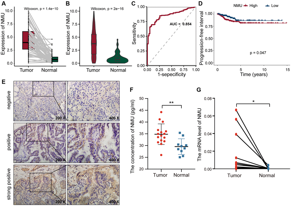 To confirm NMU expression levels, we quantified NMU protein levels in tumor tissues from 25 PTC patients with IHC, and found that the NMU positive rate was as high as 72% (18/25). NMU, as a secreted protein, was mainly present in the cytoplasm as brown and yellow granules (Figure 5E). The serum NMU levels in PTC patients (25.99–44.23 pg/ml; median = 34.82 pg/ml) was significantly higher than in healthy controls individuals (median = 29.55 pg/ml; 25.03–35.41 pg/ml; p < 0.01; Figure 5F). Finally, we compared NMU expression in 16 randomly selected pairs of cancerous and neighboring normal tissues from PTC patients, finding that NMU expression was significantly higher in cancerous tissues than in normal tissues (p < 0.05; Figure 5G). Therefore, these results suggested that NMU expression was elevated in PTC patients, consistent with our analysis results.