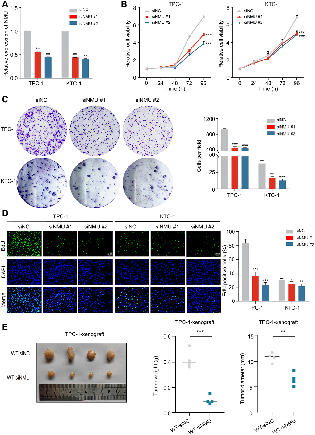 To determine the effect of NMU knockdown on cell proliferation, we used TPC-1 and KTC-1 cells and confirmed they had significant knockdown efficiency (p < 0.01; Figure 6A), then performed CCK-8, clone formation assays and EdU proliferation. We found that NMU knockdown significantly reduced the activity, colony formation ability and proliferation ability of TPC-1 and KTC-1 cells (*p < 0.05; **p < 0.01; ***p < 0.001; Figure 6B–6D). And it was further confirmed by in vivo experiments that NMU knockdown could significantly inhibit the growth of PTC (**p < 0.01; ***p < 0.001; Figure 6E).