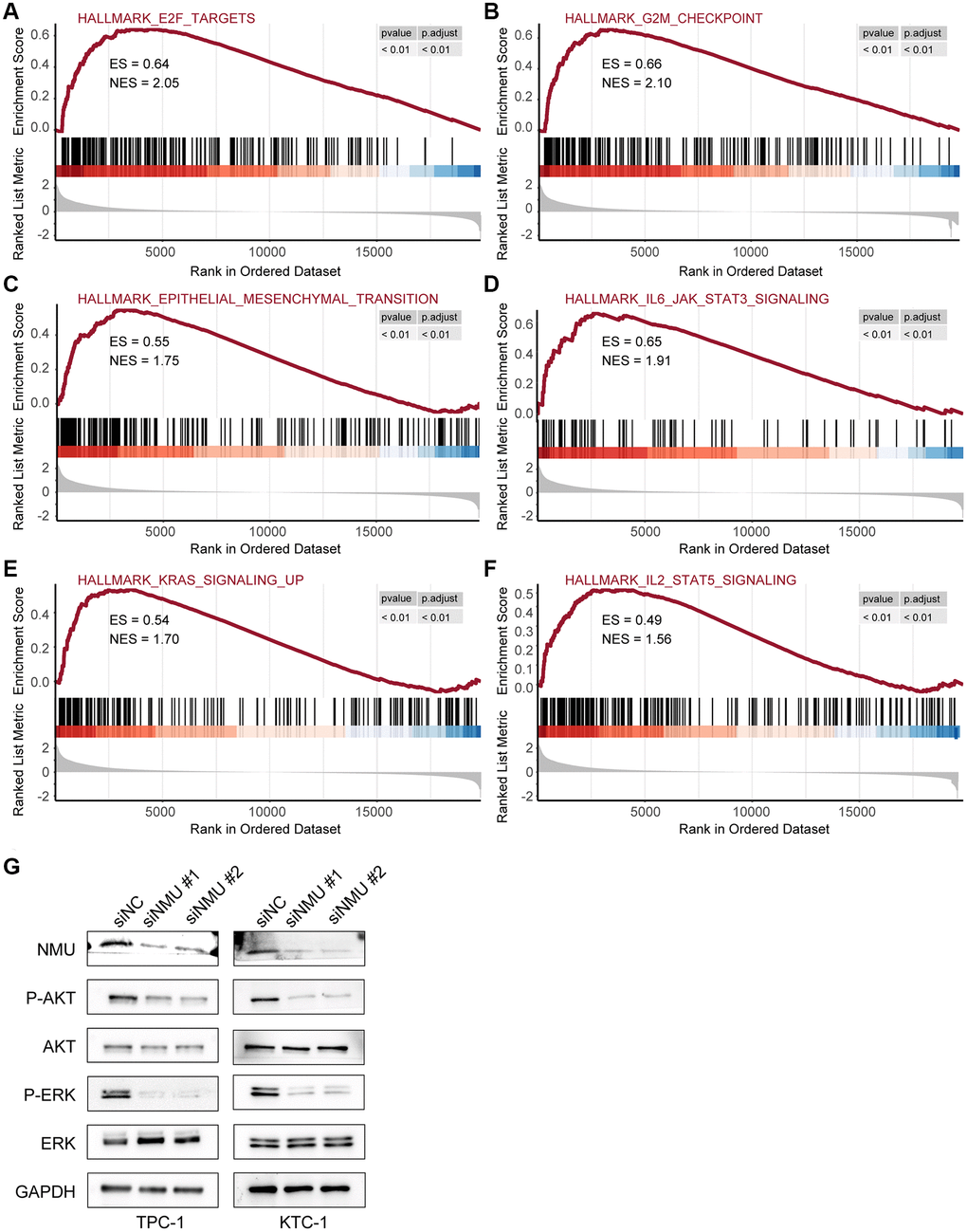 Next, we further examined the pathways significantly enriched in the high-risk group, identifying six signaling pathways: E2F targets, G2M checkpoint, epithelial-mesenchymal transition, IL6/JAK/STAT3 signaling, KRAS signaling, and IL2/STAT5 signaling (All p < 0.01; Figure 7A–7F), indicating that NMU may promote malignant PTC progression via these signaling pathways.
