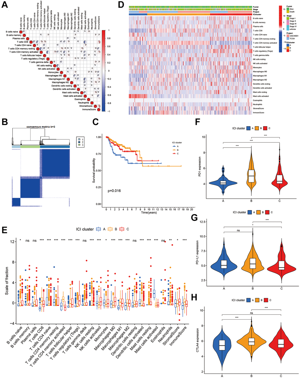 We calculated infiltration contents of the 22 immune cells of each sample. Figure 1A visualized the correlation interactions of different immune cells in TME. The ConsensusClusterPlus R package was used for sample clustering, and 3 ICI subtype classifications were obtained (Figure 1B).