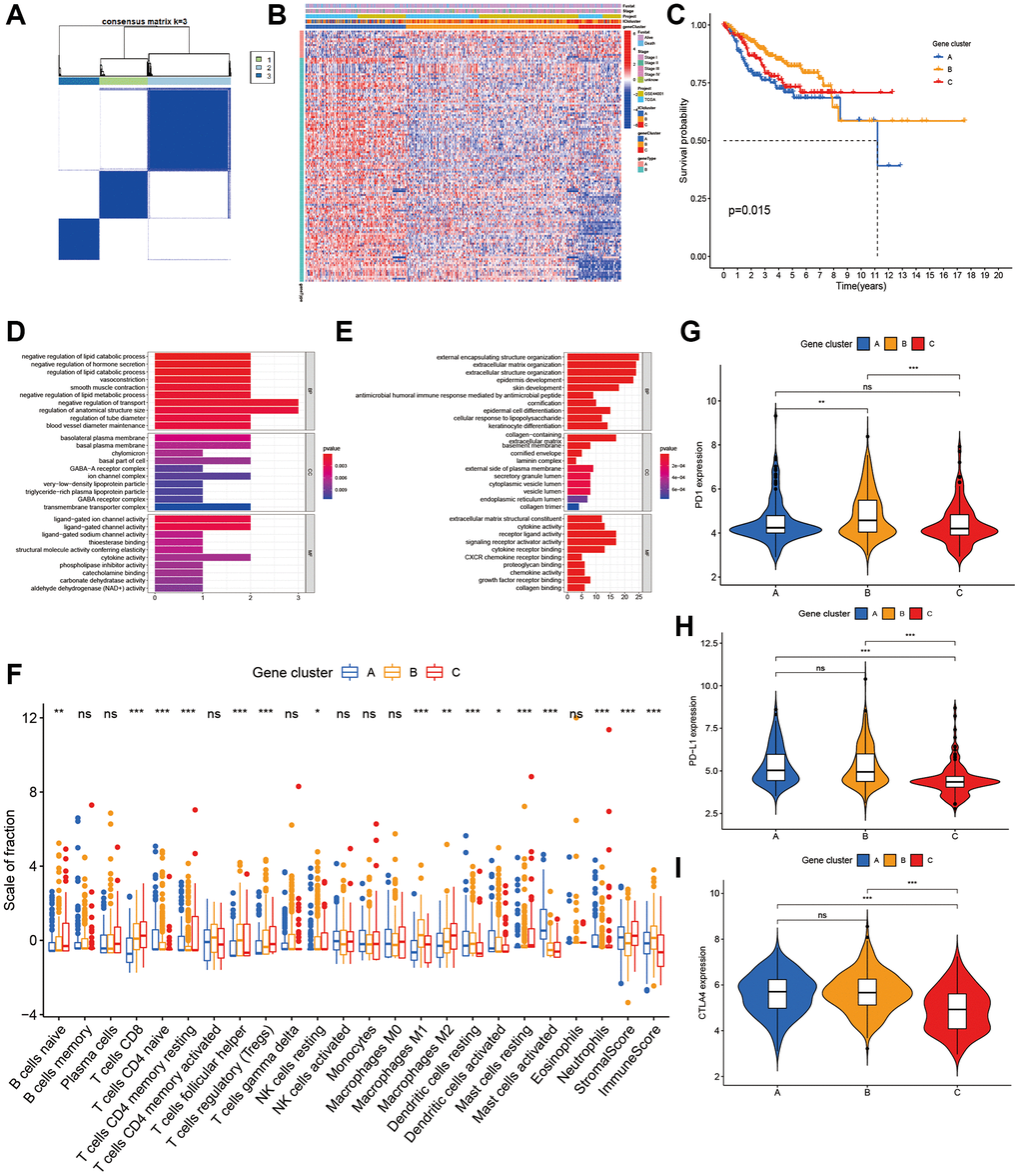 Next, we performed the Kaplan–Meier analysis on these 3 gene clusters, subjects in gene cluster A had a poor prognosis (p = 0.015, Figure 2C). As a guide from the results, gene cluster A was characterized on the low infiltration of CD8+ T cells, activated memory CD4 + T cells, and M1 macrophages, as well as low immune score and stromal score. It was also characterized on high infiltration of activated mast cells (Figure 2F). The expression of the 3 immune checkpoints in 3 gene clusters was shown in Figure 2G–2I.