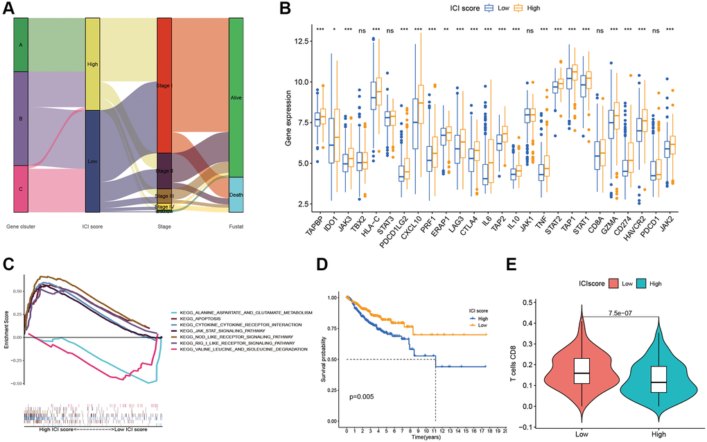 After quantifying individual ICI scores with PCA, the cases were subsequently assigned into low or high score groups. A Sankey diagram was used to visualize patients’ distributions of patients with gene clusters, stage, ICI scores, and survival status (Figure 3A). To determine immune activity and tolerance, we selected related signature genes with immune checkpoint, immune activity, and antigen presentation (Figure 3B). Biological differences between the ICI score groups were determined through gene set enrichment analysis (GSEA). These pathways included RIG-I-Like receptor signaling, apoptosis, NOD-Like receptor signaling, JAK-STAT signaling, cytokine-receptor interactions (Figure 3C). Patients with different ICI scores showed significant survival differences, with low ICI scores indicating better survival (Figure 3D).